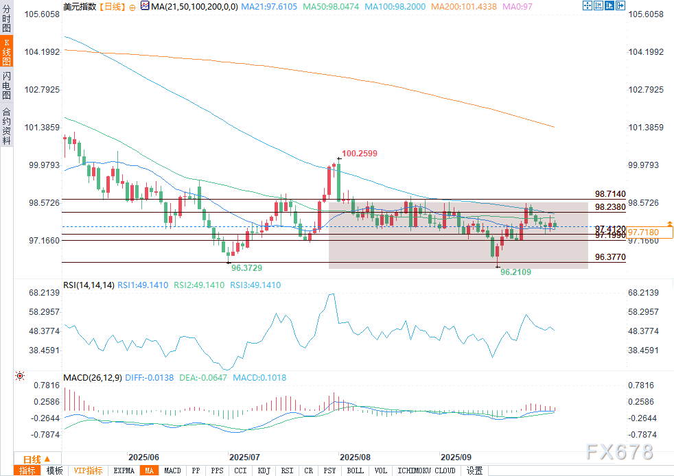 周五(10月3日)午盘时段,美元指数下跌0.1%,至97.74,预计将录得周度跌幅,且这将是自7月以来的最大单周跌幅。从价格走势来看,该指数始终难以收复50日均线(98.046),这一关键技术位本周一直是交易员的防守重点。 ![]() 从下行空间来看,若美元指数跌破97.412,可能引发更剧烈的抛售,进而下探96.377-96.218支撑区间。 政府停摆加剧不确定性,关键数据发布中断 美国政府停摆已进入第三天,关键经济数据发布陷入中断,交易员面临的不确定性持续上升。9月非农就业数据现已无法获取,这导致交易员在美联储10月政策会议前,失去了评估劳动力市场的关键依据。 “我们无法获取往常能拿到的任何数据,”激石集团(Pepperstone)策略师迈克尔·布朗表示。这种信息不明确的状况,使得市场价格波动趋于平缓,也限制了市场重新评估美联储政策预期的能力。 疲软的劳动力与服务业数据推升降息预期 尽管芝加哥联储预估失业率稳定在4.3%,但近期劳动力数据仍显疲软。ADP报告显示,美国私营部门就业人数减少3.2万人,这一数据支撑了市场对美联储进一步宽松的预期。 根据芝商所(CME)美联储观察工具,目前市场认为美联储在10月降息25个基点的概率已接近100%,12月再次降息的概率也达到89%。达拉斯联储主席洛里·洛根则温和反驳这一预期,她表示劳动力市场正逐步降温,不应急于进一步降息。 ISM服务业数据不及预期,国债收益率仍攀升 尽管ISM服务业PMI数据(50.0)低于预期(52.0),但美国国债收益率仍小幅上升。10年期国债收益率升至4.117%,2年期国债收益率触及3.57%,这一走势反映的是市场谨慎乐观情绪或持仓调整,而非对美联储政策风险的全面重新定价。 当前政治僵局可能对GDP增长构成压力,美国财政部长斯科特·贝森特警告称,若政府停摆持续,可能引发更广泛的经济后果。 市场展望:美元指数在98.05下方倾向看跌 ![]() 只要美元指数维持在50日均线下方,下行压力就可能持续。政治不确定性、新鲜经济数据缺失以及降息预期升温,均在削弱美元的支撑力。 若跌破97.412,美元看跌动能可能加速;除非宏观层面的整体不确定性消退,否则任何反弹都可能在98.714斐波那契阻力位下方遇阻。未来几个交易时段,交易员应密切关注利率相关评论及美联储官员的表态。 北京时间00:28,美元指数报97.7120/260,跌幅0.17%。 |