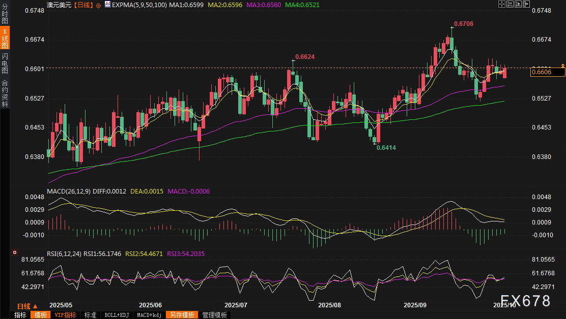 周一(10月6日)亚欧时段,澳元兑美元在TD-MI通胀指标数据发布后上涨,表明第三季度通胀可能高于预期,尽管澳大利亚储备银行(RBA)努力将通胀控制在2-3%的目标范围内。澳元在盘初一度低开0.3%至0.6580,随后一度转为上涨0.2%,目前交投于0.6603附近,涨幅约0.08%。 ![]() 美元指数(DXY)衡量美元兑六种主要货币的价值,目前在98.22左右交投,涨幅约0.54%,因日本政局出现意外,可能出现首位女首相,日元大跌,给美元指数提供上涨动能。然而,随着市场对美联储在未来会议上降息的可能性增加,美元可能会面临挑战。CME FedWatch工具显示,市场目前预计10月降息的可能性为95%,12月再次降息的可能性为84%。 由于美国参议员第四次未能通过重新开放联邦政府的支出提案,美元可能面临进一步压力,政府停摆将延续到新的一周。停摆已暂停关键联邦项目,并推迟了包括原定于周五发布的9月就业数据在内的主要经济报告。 上周三发布的美国ADP就业变动报告显示,9月私营部门就业人数减少32000人,年薪增长率为4.5%。这一数据继8月减少3000人(从之前报告的增加54,000人修正)之后,低于市场预期的50000人。 最新职位空缺数据显示,劳动力市场正在放缓,但8月职位空缺从721万个增至723万个。同时,招聘率降至3.2%,为2024年6月以来的最低水平,而裁员率保持在低位。 白宫宣布,澳大利亚总理安东尼·阿尔巴尼斯和美国总统唐纳德·特朗普将于10月20日在华盛顿特区举行首次面对面会晤,讨论Aukus核潜艇协议。 标普全球澳大利亚综合PMI从8月的55.5降至9月的52.4,标志着连续一年的月度增长,但增速为6月以来最慢。同时,服务业PMI从55.8降至52.4,表明服务业连续第20个月扩张,但增速也是6月以来最弱。 澳大利亚8月贸易顺差收窄至1825百万澳元(环比),低于预期的6500百万澳元和前值7310百万澳元。8月出口环比下降7.8%,前一个月为增长3.3%,因黄金出口在连续强劲表现后下降。进口在8月环比增长3.2%,相比7月下降1.3%。 澳元仍突破0.6600,九日EMA 周一,澳元/美元交易在0.6607左右。日线图技术分析显示,该货币对在上升通道内移动,表明看涨趋势占主导地位。此外,14日相对强弱指数(RSI)略高于50水平,进一步强化看涨趋势。 上行方面,澳元/美元可能目标为9月17日录得的12个月高点0.6707。突破这一水平将支持该货币对测试上升通道上边界0.6780。 即时支撑位位于心理关口0.6600,接近九日指数移动平均线(EMA)0.6596。进一步下跌将触及50日EMA 0.6560的支撑位,随后是上升通道的下边界0.6550。如果跌破该通道,可能会出现看跌趋势,对澳元/美元施加下行压力,可能跌至8月21日录得的四个月低点0.6414区域。 ![]() 北京时间14:58,澳元兑美元现报0.6607/08。 |