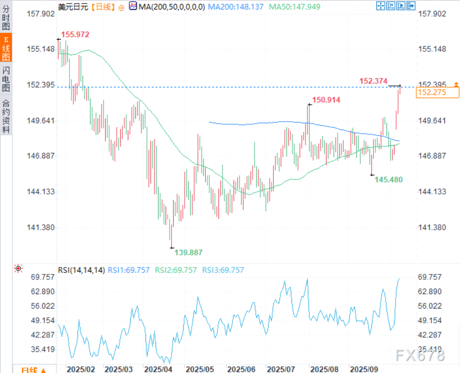 短期来看,日元正经历一段艰难时期。周三(10月8日)美元兑日元连续第五个交易日走高,本周涨幅逾3%,显示美元兑日元持续走强,亚市早盘时段一度达到二月以来的最高点(152.43)。目前,由于日本新领导层提出的财政政策存在不确定性,看涨动力依然强劲。这种不确定性导致日元持续承压,只要这一前景不变,未来几个交易日美元兑日元的买盘压力可能继续增强。 ![]() 10月4日,高市早苗当选日本自民党新总裁,这位拥有丰富内阁经验的资深政客,在获得国会确认后,即将成为日本首位女性首相。 真正引发市场震荡的是其新政府即将推出的经济计划。高市早苗素来主张通过激进的公共支出刺激经济增长——这一立场已引发对日本债务攀升和财政可持续性的担忧。更值得关注的是,为短期经济维稳,其政府可能推行更低利率政策,这或与日本央行控制通胀的目标形成冲突。 观察日本通胀曲线可见,虽物价涨幅有所回落,但8月最新数据仍达2.7%,持续高于2%的政策目标。这表明日本央行应维持紧缩政策以平抑通胀。然而政府的新财政方针可能削弱这一努力,导致通胀管控力度显弱,进而动摇市场对日元需求的信心。 ![]() 此外,财政不确定性、经济过度刺激风险与通胀管控乏力三重因素叠加,可能进一步削弱对日元的信心,导致其持续丧失吸引力。这种环境有望在短期内巩固美元兑日元的稳定买盘压力。 美元正在复苏吗? 尽管美国政府停摆持续,美元近几个交易日仍展现韧性并出现反弹。这种强势部分源于其在美国政治不确定性中扮演的临时避险角色。 美元指数(DXY)也印证了美元复苏,该指数始终维持在98点上方,近期交易时段保持稳健上行态势。 ![]() 技术分析 自4月下旬以来,美元兑日元始终维持稳健的看涨格局,数个整理区间构成连续的结构性支撑。近期多头动能推动汇价创出新高,确认主导趋势仍为上行。若价格有效突破关键阻力位,短期买盘压力或将持续主导市场。 相对强弱指数显示过去14个交易日的平均买入动能保持强劲,但该指标正逼近超买区间(70水平上方),预示市场可能进入短期失衡阶段。若买盘压力过度亢奋,不排除出现技术性回调的可能。 关键位置: 153.00——当前阻力:整数心理关口构成最近一道阻力,若能有效突破该点位将巩固既存上涨趋势,但需警惕在此附近发生短期技术修正。 155.92——核心阻力:为2月以来未见的重要水平。若汇价突破此阻力位,可能激发更强劲的多头延伸,强化中期看涨预期。 148.10——核心支撑:处于50周期移动平均线(147.95)及200周期移动平均线(148.14)附近。若失守该支撑位,将威胁现有上升趋势线,可能导致汇价转向短期看跌。 ![]() 北京时间09:04,美元兑日元交投于152.37/38。 |