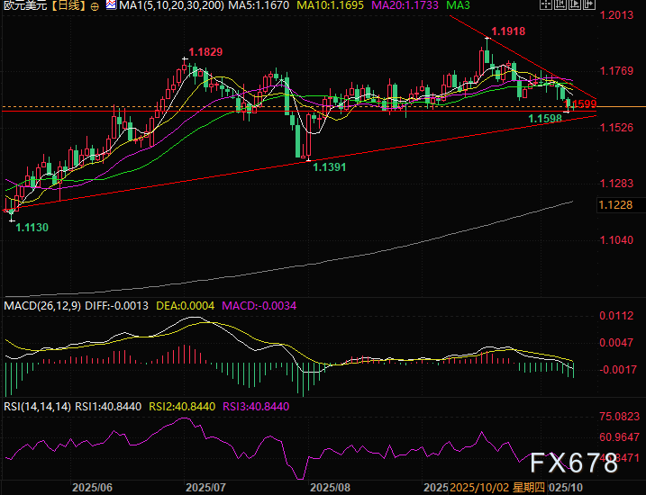 周四(10月9日)亚欧时段欧元兑美元(EUR/USD)走出了宽幅震荡的走势,目前交投于1.1600上方,守住了1.1600支撑位;此前在周四欧洲时段开盘时,该货币对在1.1650附近遇阻承压。受法国政治不确定性影响,投资者保持警惕,欧元的上行动能始终偏弱。 ![]() 美国方面,政府停摆已进入第八天,恢复资金拨款的谈判仍无进展;在关键经济数据暂停发布的背景下,来自美联储的消息成为当前核心基本面驱动因素。周四凌晨公布的美联储上次会议纪要显示,美联储在微调货币政策过程中面临显著挑战:就业市场呈现疲软态势,而通胀风险则偏向上行。 值得注意的是,据美国《财富》杂志10月7日报道,美国哈佛大学经济学家杰森·弗曼(JasonFurman)的一项研究发现,2025年上半年美国国内生产总值(GDP)增长几乎完全由数据中心和信息处理技术推动,在这些技术以外的其他领域,美国的增长率仅为0.1%。 弗曼在社交媒体上发布的研究数据显示,今年上半年,信息处理设备和软件的投资仅占到美国GDP的4%,但它们占到GDP增长的92%。上半年美国GDP平均增长1.6%,但如果剔除数据中心和信息处理技术等领域,美国GDP增长率仅为0.1%,几乎停滞不前。 周五凌晨,多位美联储官员将发表讲话,为美联储的货币政策规划提供更多线索。不过,在关键经济数据缺失的情况下,他们大概率不会改变市场现有共识——即美联储在今年剩余的货币政策会议中,仍将实施两次降息。 市场动态一揽:市场情绪好转为欧元提供喘息空间 周四,市场情绪略有回暖,为欧元带来一定喘息空间,但欧元的下行趋势并未扭转。法国总统马克龙预计将任命新总理,但新总理将面临与前五位总理相同的难题——解决该国的预算问题。 德国8月贸易顺差录得172亿欧元,高于7月的142亿欧元,超出市场预期。不过,此次顺差扩大主要源于进口额下降1.3%,这一降幅抵消了出口额0.5%的下滑(出口额已连续第二个月低于预期)。 此前在周三,德国已公布8月工业产出下降4.3%;此次贸易数据与工业产出数据共同印证了德国作为欧元区核心经济体经济增长动能疲软的现状,进一步对本就走弱的欧元形成压制。 美国方面,周四凌晨公布的美联储9月货币政策会议纪要显示,政策制定者在“需采取多大力度的宽松措施以支持经济增长且不推升通胀”这一问题上存在分歧。9月17日美联储发布的《经济预测摘要》中包含的点阵图显示,对于今年至少再降息两次的提议,投票结果为10票支持、9票反对。 地缘政治层面,以色列与哈马斯已达成停火协议,尽管这份协议看似稳定性不足,但截至目前,已为市场情绪改善起到了推动作用。 技术分析:欧元兑美元仍靠近1.1600支撑位 欧元兑美元的反弹走势持续遭遇抛售压力,空头趋势得以维持。此前的1.1650整数支撑位目前已转化为阻力位,限制欧元上行空间,而1.1600支撑位已近在咫尺,风险逐步升温。相对强弱指数(RSI)仍远低于50,显示空头压力显著。 欧元兑美元在1.1650关口遇阻,这一走势印证了空头仍主导市场;不过,1.1600附近的支撑位(或具备较强支撑力度。若该支撑位失守,下一目标将指向8月周三低点与趋势线支撑位重合处)22日和27日低点(近1.1575),再进一步则是8月5日低点1.1530——不过,从周三的走势来看,1.1530这一水平目前仍遥不可及。 欧元兑美元的即时阻力位位于1.1645-1.1650区间(9月25日和10月6日低点),突破该区间后将面临下行趋势线阻力(目前位于1.1690附近)。若突破这一趋势线阻力,或暗示趋势转向,届时市场焦点将转向上周高点1.1765-1.1775区间。 ![]() 北京时间18:30,欧元兑美元现报1.1623/24。 |