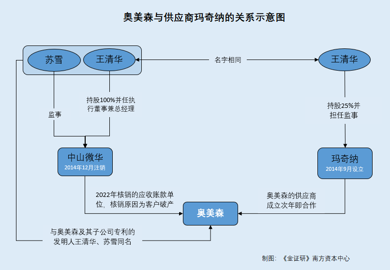 2025年1-6月,奥美森营业收入为19,137.7万元,较上一年同期增长17.75%,净利润为3,297.6万元,较上一年同期增长27.24%。 即此番申报上市,奥美森的营业收入及净利润在2022年下滑后,2023年起重回增长模式。 2021-2024年,奥美森的主营业务毛利率分别为41.94%、37.65%、43.35%、44.94%,同期可比公司平均主营业务毛利率分别为39.82%、39.86%、38.01%、34.01%。 其中在2021-2024年,可比公司宁波精达成形装备股份有限公司(以下简称“宁波精达”)毛利率分别为37.1%、40.7%、41.38%、41.11%。 对此,奥美森表示,其主营业务毛利率与可比公司存在一定差异,主要系产品类型及应用领域不同所致。其中,可比公司宁波精达产品及应用领域与奥美森最为相似,毛利率与奥美森较为一致。 简言之,2023-2024年,奥美森的毛利率高于同行均值。对此,奥美森称系因产品类型及应用领域与可比公司不同所致。 1.2 2022年以客户中山微华破产为由核销对其性质为销售款的应收账款,而中山微华于2014年已注销 据签署于2025年9月19日的招股书,2022年末,奥美森实际核销应收账款金额为9.9万元。其中在2022年9月25日,奥美森核销对中山市微华机电科技有限公司(以下简称“中山微华”)的应收账款(销售款)3.69万元,核销原因为客户破产,并表示款项并非因关联交易产生。 据市场监督管理局数据,中山微华于2011年11月24日注册成立,并已于2014年12月17日注销。注销前,中山微华的地址为中山市南区城南二路34号之二3幢5车间,由王清华持有100%股权并担任执行董事、总经理,由苏雪担任监事。 即2022年9月,奥美森以客户中山微华破产为由,核销对其销售款。而市场监督管理局数据显示,中山微华于2011年设立并已于2014年12月注销。 1.3 中山微华股东王清华及监事苏雪,与奥美森及子公司的专利发明人“同名” 据奥美森签署日期为2015年6月12日的公开转让说明书(以下简称“签署于2015年6月的公转书”),奥美森彼时拥有的专利包括发明专利“一种高速冲床送料机构”及实用新型专利“一种压力冲床”,上述两项专利的发明人均为“王清华”。 据国家知识产权局数据,截至查询日2025年10月9日,发明专利“一种高速冲床送料机构”申请于2007年10月,申请人为奥美森的子公司郴州智造科技有限公司,处于专利权维持状态。实用新型专利“一种压力冲床”申请于2008年1月,申请人为奥美森,案件状态为届满终止失效。 此外,发明专利“一种机械手及一种蛇形机器臂系统装置的实现方法”、和实用新型专利“一种机械手”由中山市博奥精密制造科技有限公司(曾用名为中山市博奥控制技术有限公司,以下简称“博奥精密”)于2016年申请,案件状态分别为专利权维持、放弃专利权(重复授权)。上述2项专利的发明人均包括“苏雪”。 另外广东政府2022年9月发布的信息显示,奥美森的专利“一种用于定位夹爪的装置和夹管装置”被列入第二十三届中国专利奖嘉奖名单,该专利的发明人包括“苏雪”。 截至招股书签署日2025年9月19日,博奥精密系奥美森的全资子公司。博奥精密在2015年1月设立,而奥美森自2015年1月起将博奥精密纳入合并报表范围。 不难看出,中山微华的全资股东“王清华”及监事“苏雪”,刚好与奥美森及其子公司所申请专利的专利发明人“王清华”、“苏雪”同名。 1.4 供应商玛奇纳由同名的“王清华”参与设立,成立次年即合作且2022年收入或主要来自奥美森 据签署于2025年9月19日的招股书,2022年,奥美森向中山玛奇纳智能设备有限公司(以下简称“玛奇纳”)采购冲床主体、集料架部件等,采购金额283.14万元。同时,奥美森向玛奇纳销售加工服务,销售金额为12.1万元。 另外,2022年3月31日,奥美森与供应商玛奇纳签订采购合同,合同内容为冲床主体、集料架部件、开卷机部件、浸油箱、小油部件、吸附箱,合同金额231万元。2022-2024年,合同状态为正在履行。 2023-2024年末,玛奇纳均为奥美森余额前五名的预付账款单位之一,奥美森对玛奇纳预付账款分别为42.23万元、32.8万元。 据签署日期为2023年8月8日的《关于奥美森股票公开转让并挂牌申请文件的审核问询函的回复》,玛奇纳于2014年9月22日成立,主要股东为王晨谕、王清华、赵晖、龙梅,其中王晨谕系实控人。2015年,玛奇纳与奥美森开始合作时间。2022年,玛奇纳的年末社会缴纳人数为1人,员工人员为6人,经营规模为年销售额300-400万元。 对此,奥美森表示,玛奇纳虽然员工较少,但是主要人员在冲床等配件方面具有资深的从业经历及较强的设计和开发能力,可以满足玛奇纳对原材料的定制化需求,同时因与奥美森在同一所在地售后服务有保障,因而玛奇纳与其建立了稳定的合作关系,具有商业合理性。玛奇纳不存在与其人员、场地混同的情形,双方不存在潜在关联关系或其他利益安排。 据市场监督管理局数据,2014年9月,玛奇纳由王晨谕、王清华、赵晖、龙梅分别认缴出资50万元、50万元、50万元、50万元,持股比例分别为25%、25%、25%、25%。截至查询日2025年10月9日,玛奇纳出资比例未变更,由王晨谕担任执行董事、总经理、财务负责人,王清华担任监事。 可见,2014年9月,玛奇纳由王清华等人出资设立。2015年即成立次年,玛奇纳即与奥美森开展合作。2022年,奥美森向玛奇纳采购283.14万元。而奥美森新三板挂牌问询回复称,玛奇纳的2022年的年销售额300-400万元。即经测算,玛奇纳的收入或至少七成来自奥美森。