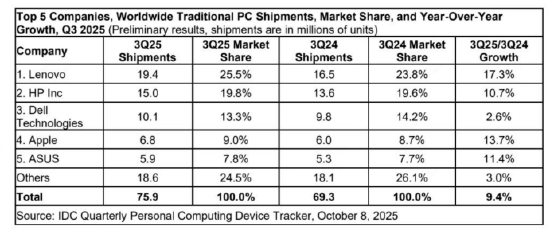 仟茂科技讯 10月10日中午消息,根据国际数据公司(IDC)《全球季度个人计算设备追踪报告》发布的初步结果显示,2025年第三季度,全球传统个人电脑(包括台式机、笔记本电脑和工作站)市场出货总量达到7590万台,相较于去年同期(6930万台)增长了9.4%。