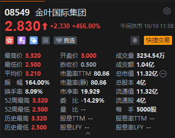 金叶国际集团上市首日涨466%。据此前消息,上一交易日,金叶国际集团暗盘一度暴涨900%,最高涨至5.00港元;最终暗盘收涨472%,报2.86港元。每手5000股,不计手续费,一手赚11800港元。公开发售阶段金叶国际集团获11464.72倍认购,公开发售的发售股份最终数目为1000万股份,占发售股份总数的约10%。合共接获约16.81万份有效申请,受理申请数目2000份,申购一手获配发股份占所申请股份总数的概约百分比为0.50%。此外,国际配售阶段金叶国际集团获1.20倍认购,国际发售股份最终数目为9000万股股份,相当于发售股份总数的90%。