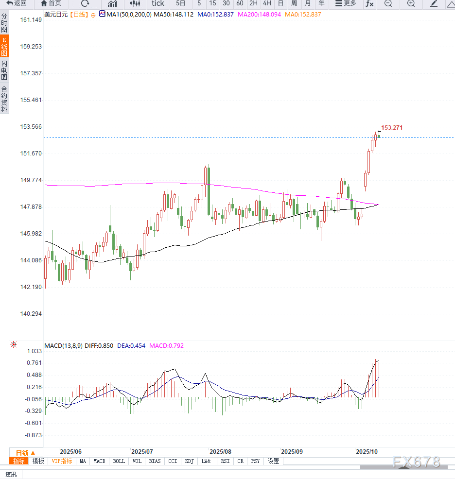 日本财政前景的不确定性继续削弱了日元的吸引力。市场担忧新任自民党领导人高市早苗可能推行更具扩张性的财政政策,这意味着日本央行(BoJ)的加息计划或被进一步推迟。 ![]() 与此同时,美国美元维持强势。尽管美联储年内仍可能降息两次,但受日本与法国政治不确定性影响,美元指数(DXY)突破两个月高位。美国政府停摆已进入第二周,参议院多次未能通过预算案,但这似乎并未削弱美元买盘。 美国方面,本周市场关注密歇根大学消费者信心指数及美联储官员讲话,预计将为美元走势提供短期方向。整体而言,美元兑日元(USD/JPY)仍保持强势,接近年内高位。 从技术面看,美元兑日元在突破151.00关键阻力后,连续测试153.00上方,显示多头趋势依旧稳固。日线RSI指标显示汇价略有超买,短期可能出现温和调整,但整体结构仍指向上行通道。 若价格维持在152.60至152.00支撑区上方,后市或再次上攻153.75至154.00区间,进一步目标指向154.70至155.00心理关口。 市场分析师Haresh Menghani指出: “尽管日元短线可能受避险买盘支撑,但财政扩张预期和日本央行谨慎的加息态度,仍将限制其反弹空间。美元兑日元若稳固于153上方,可能开启新一轮升势。” ![]() 从宏观角度看,日本当前面临财政扩张与通胀稳定的双重挑战,高市早苗上任后可能重启“安倍式政策”框架,使得日元承压成为中期趋势。 若美国通胀维持韧性、美联储降息延后,美元的相对收益将进一步放大。短期调整虽不可避免,但美元兑日元中期升势的基础仍然稳固,等待低吸机会。 |