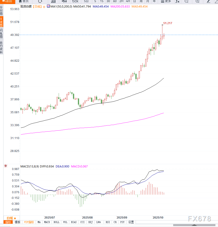 周五亚洲交易时段,现货白银(XAG/USD)延续强势上涨,交投于每盎司49.70美元附近。银价已连续多个交易日保持在高位区间,反映出市场对避险资产的强劲需求。 ![]() 白银协会(Silver Institute)首席执行官Michael DiRienzo表示: “全球经济的不确定性显著增加,而在这种环境下,投资者倾向转向实物资产,例如白银。” 其次,美联储的政策预期成为银价上涨的重要推手。根据CME FedWatch工具显示,市场当前预计美联储在10月会议上有近95%的概率降息25个基点,而12月再次降息的概率略降至82%。 利率下行将降低持有无收益贵金属的机会成本,从而支撑白银价格。 在工业需求方面,白银在新能源、电子与光伏领域的消费持续增长,也为其提供了中期支撑。随着制造业数据回暖,市场预期工业金属需求将保持稳定。 从日线图来看,银价突破49.50美元关键阻力后,技术面明显偏强。均线系统呈多头排列,MACD指标持续放量,显示上行动能充足。若价格稳守49.30美元上方,后市有望测试50美元整数关口及50.80美元的心理高位。 相反,若出现获利回吐,48.80美元将成为短期支撑位。整体来看,银价处于上升通道中,短线虽有调整风险,但趋势依旧偏向多头。 市场分析师Lallalit Srijandorn指出: “白银的上涨不仅反映避险买盘,还体现市场对美联储宽松周期的提前定价。若降息落地,银价突破50美元关口只是时间问题。” ![]() 当前银价的上涨具备宏观与技术双重支撑。尽管短期可能受美元波动或消费者信心数据影响而出现震荡,但避险需求与降息预期的叠加,构成银价坚实的底部支撑。 若美联储释放更强烈的宽松信号,银价有望进入新的上升周期。 |