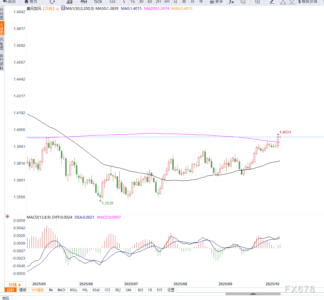 周五亚洲交易时段,美元兑加元小幅整理,交投于1.4020附近,维持在六个月高位区间。前一交易日该货币对上涨约0.5%,主要受到油价走低及市场避险情绪升温的推动。 ![]() 市场分析师Akhtar Faruqui指出: “随着中东局势缓和和油价回落,加元失去了短期支撑,而美元在避险需求驱动下重新获得优势。” 尽管美元在政府停摆和避险情绪推动下表现坚挺,但美联储官员的鸽派言论限制了其进一步上涨的空间。 旧金山联储主席Mary Daly表示,美国通胀降幅超出预期,美联储预计未来仍将进行“风险管理式降息”。同时,美联储副主席Michael Barr也指出,当前的政策立场仍具限制性,未来路径将取决于经济数据表现和财政僵局的持续时间。 从日线图来看,美元兑加元突破1.4000关口后形成新的上升通道。RSI指标处于略微超买区域,但均线系统依旧呈现多头排列,显示上行趋势完好。 若汇价稳守1.3980支撑,短线有望继续上攻至1.4050—1.4100区间。若出现回调,1.3950将是重要防守位。整体来看,美元兑加元仍处于多头主导格局中。 ![]() 当前美元兑加元的强势更多反映出加元的被动走弱而非美元的主动上攻。美联储的宽松预期与油价下行叠加,使汇价短期内缺乏明显回调动能。 然而,若后续美国消费者数据疲软或美联储加速降息进程,美元上行动能或将受限。中期来看,1.4000关口仍是关键支撑区域,需警惕油价反弹对加元的潜在提振作用。 |