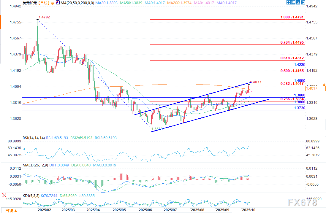 周五(10月10日)欧盘时段,加拿大统计局即将发布劳动力调查报告,市场普遍预计这份报告的统计数据会呈现复杂多样的态势。如果这份经济报告的走势较为疲软,那么加拿大央行就有更多理由继续实施宽松货币政策。在连续三次暂停降息后,加拿大央行于9月17日的会议上将基准利率下调了25个基点,降至2.50%。 ![]() 市场预计,加拿大央行在10月29日的会议上再次降息的可能性约为70%;同时,隐含的利率预期显示,到年底时利率可能会下调近25个基点。如果就业市场的数据表现疲软,那么本月晚些时候进一步降息的可能性就会增加,而这反过来又可能对加元的表现产生负面影响。 TD证券分析师的分析:“预计9月份就业人数将增加5000人,这是在经历了两个月大规模裁员之后的温和反弹。服务业的招聘活动应该会成为推动就业数据上升的主要动力,而商品生产行业的就业情况则可能表现参差不齐。” 目前几乎没有迹象表明加拿大就业市场正在复苏。今天早间的加拿大就业报告或许能带来一些缓解作用,但也未必如此。 此前8月和7月的经济活动分别导致了65,500个和40,800个就业岗位的流失。如果劳动力市场调查结果不佳,加拿大央行很可能会将基准利率下调至其认为的‘中性区间’(2.25%至3.25%)以下,这将进一步对加元构成压力。 技术分析 ![]() 美元/加元在1.3900附近盘整近两周后,于周四重拾看涨走势。这一变化的背景是美国以外地区政治不确定性上升,推升了市场对美元的避险需求。 该货币对突破200日简单移动平均线(SMA),将自6月低点1.3538开启的上行趋势延续至1.4032的六个月高位。值得注意的是,4小时图显示该货币对似乎已向上突破对称三角形形态。由于各条简单移动平均线(SMA)仍呈正向排列,这一突破预示着后续可能进一步上涨。 不过,当前需保持一定谨慎。原因在于,价格正处于1-6月下跌区间的38.2%斐波那契回撤位附近,该位置此前曾在5月限制涨势,使汇率受阻于1.4017附近。同时,上行通道上轨也处于相近区间。叠加日线图相对强弱指数(RSI)徘徊在70超买水平附近,回调风险有所上升。 因此,能否站稳1.4050关口并收于该水平上方,是决定涨势能否延续的关键。若突破该位置,汇率可能进一步向50%斐波那契回撤位1.4165推进。突破这一水平后,美元/加元或挑战自疫情期间低点绘制的长期上升趋势线(约1.4230),之后再测试61.8%斐波那契回撤位1.4313。 若出现看跌情景,即汇率回落至200日简单移动平均线1.3976下方,市场焦点将转向20日和50日简单移动平均线,对应的支撑位分别为1.3887和1.3830。若该区域抛售压力加剧,推动价格跌破通道下轨1.3800,支撑位可能出现在1.3730附近的双底形态区域。 总体而言,美元/加元此次冲高提升了其看涨潜力,但除非能明确突破1.4050关口,否则仍存在回调风险。 |