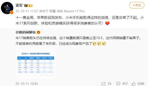 格隆汇10月11日|雷军发文称:十一黄金周、苹果新品刚发布,小米手机能取得这样的成绩,还是非常了不起。小米17系列创新、体验和质感确实获得很多消费者的认可!