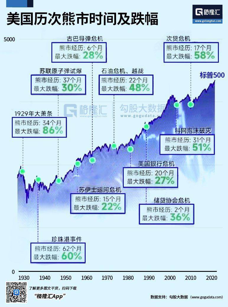 格隆汇10月11日|美股周五受特朗普关税威胁全线大跌,许多人开始担心美股是否会见顶回落进入熊市。盘点美国历次熊市时间及跌幅,如下图: