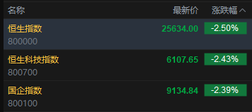美股上周五显著下挫,中美贸易战再起,特朗普威胁大幅加征中国进口货关税,引起市场恐慌,三大指数均录得显著跌幅收市。美元走势回落,美国十年期债息下滑至4.05厘水平,金价表现向好,油价则显著受压。 今日港股三大指数集体低开,恒生指数跌2.50%,报25634.00点,恒生科指跌2.43%,国企指数跌2.39%。盘面上,科网股全线下跌,哔哩哔哩跌超5%,小米跌超4%,联想、阿里巴巴、腾讯、美团、快手、京东跌超3%,网易涨超3%;黄金股普涨,紫金黄金国际涨超4%;汽车股普跌,蔚来跌超4%;半导体板块走弱,晶门半导体跌超7%;创新药概念重挫,药明合联跌超5%。