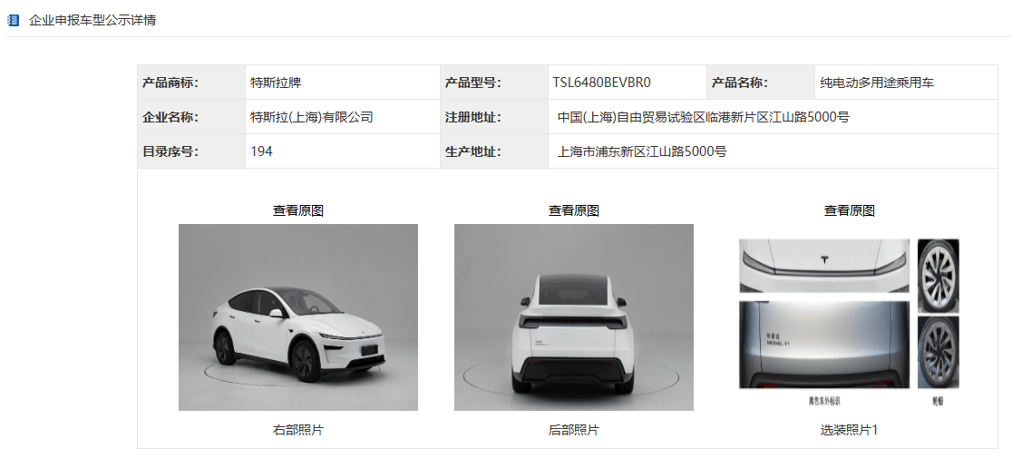 10月9日,工信部发布第400批《道路机动车辆生产企业及产品公告》新产品公示,特斯拉Model Y出现在本次公示中。根据公示信息,该车型搭载三元锂离子电池组与3D6电机,与当前Model 3后驱长续航版配置相同。业内认为,该款车型是与Model 3后驱长续航版一样的版本。 这一判断随后得到了官方人员的侧面证实。一位特斯拉工作人员向《每日经济新闻》记者确认,此次在公告中的Model Y车型即为后轮驱动长续航版车型。参考目前售价25.95万元的Model 3长续航后轮驱动版及售价26.35万元的现款Model Y后轮驱动版,有观点预计,新款Model Y后驱长续航版的售价可能在28万元左右。 特斯拉开启多维度产品攻势 根据公示内容,外观方面,新车延续现款Model Y的设计,车尾配有“Model Y+”标识。车身尺寸保持不变,长宽高分别为4797/1920/1624mm,轴距为2890mm,座位数为5座。动力方面,Model Y长续航后轮驱动版搭载三元锂电池单电机,驱动电机峰值功率为225kW,较现款Model Y后轮驱动版提升了5kW。