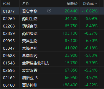 生物医药股普跌,君实生物跌超10%。方正证券认为,关税战再度来袭,医药行情无需过度担忧。作为今年以来第二次发生的关税战,市场对中美博弈已有一定预期,尤其在医药行业内部来看,自今年4月第一次关税战后,创新药及CXO行业表现一骑绝尘,远远领先于其他子行业,创新药源于中国自主创新力量的崛起与海外BD的持续兑现,并不受关税的影响;CXO板块源于海外业务的持续发力,上下游之间极强的粘性以及CXO的服务定价模式使得企业可以相对自由转嫁关税压力。