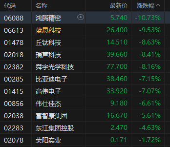 苹果概念跌幅居前,鸿腾精密跌超10%。有分析称,港股市场科技股多数表现不佳,这种科技板块的疲软,直接拖累了苹果产业链上的相关公司。市场研究机构Counterpoint的报告显示,2025年第三季度前八周,中国智能手机市场销量同比下降了2%,并且预计当季整个中国市场会出现小幅下跌。中国智能手机市场的持续疲软,引发了市场对消费电子行业,包括苹果产品需求的担忧。