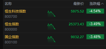 10月13日消息,港股三大指数集体下挫。截至午间收盘,恒生指数跌3.49%,报25373.43点,恒生科技指数跌4.54%,国企指数跌3.48%。盘面上,科网股全线下跌,小米、哔哩哔哩跌超7%,快手、联想跌超6%,京东、百度、阿里巴巴跌超5%,腾讯跌超4%,美团跌超3%;稀土板块大涨,金力永磁(300748)涨超12%;苹果概念跌幅居前,鸿腾精密跌超10%;生物医药股普跌,君实生物跌超10%;汽车股走弱,蔚来跌超6%。