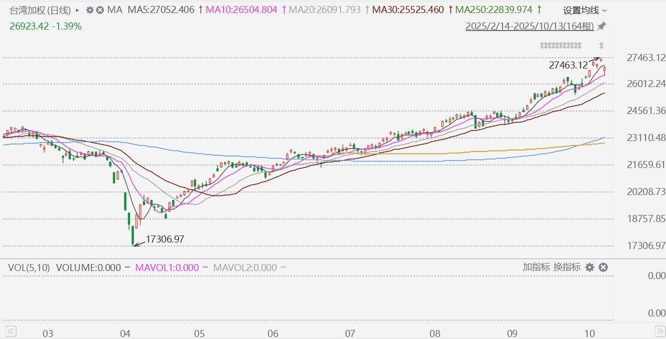 格隆汇10月13日|台股收跌,台湾加权指数收跌1.39%,报 26923.42点。台积电(2330.TW)收跌1.39%,报1420元新台币。