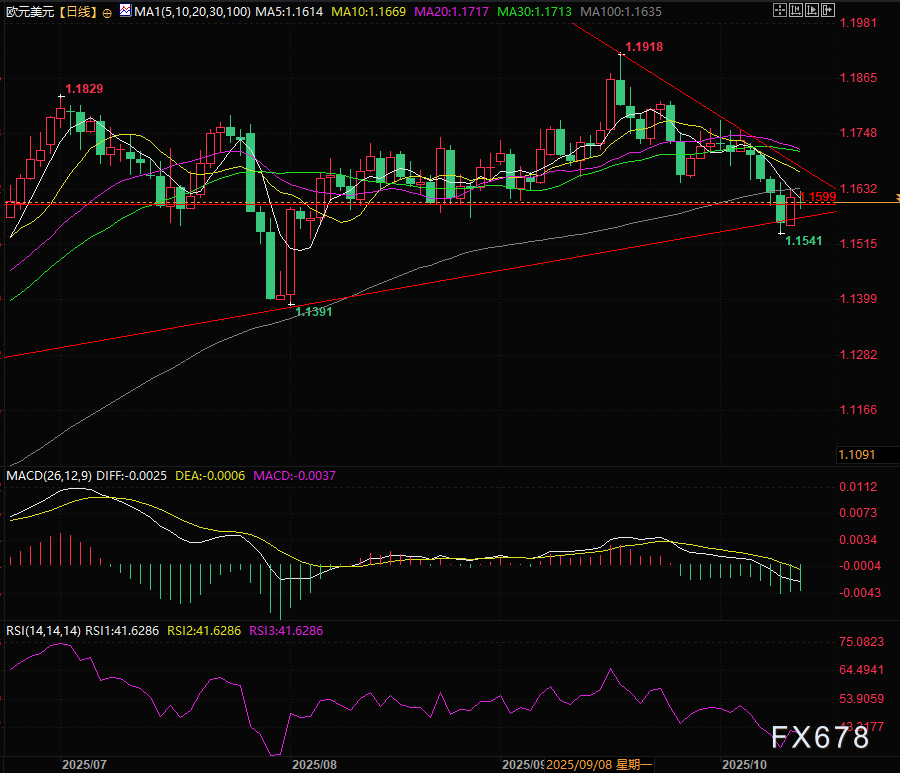周一(10月13日)亚欧时段,欧元兑美元延续趋势小幅下跌0.14%交投于1.1603附近,受美国关税问题担忧影响上个交易日欧元一度反弹0.5%。上周前四个交易日本来美元受法国、日本政治忧虑引发的避险情绪推动,大幅走强,欧元兑美元汇率整体跌至近两个月低位附近,但上周五受美国关税问题担忧影响,美股、美元指数整体大跌,欧元借机喘息反弹。我们对上周主要影响欧元的事件做了总结。 ![]() 上周一,市场即迎来法国方面的利空消息:法国总理塞巴斯蒂安·勒科尼在其内阁组建不足24小时后宣布辞职。法国的政治危机始于一年多前,当时总统埃马纽埃尔·马克龙呼吁提前举行议会选举,称法国政府需“在稳定和谐的氛围下获得明确多数席位”。然而,此次选举最终导致极右翼议员席位大幅增加,议会陷入悬峙状态。数月后,马克龙承认,此次选举“未为法国民众带来解决方案,反而加剧了国民议会的分歧”。 勒科尼是第五位因未能推动预算案在议会通过、以应对法国巨额债务而辞职的总理。目前法国债务规模已突破3万亿欧元,约占其国内生产总值(GDP)的114%。 马克龙曾要求勒科尼留任并尝试组建联合政府,但此举以彻底失败告终。事实上,极右翼领导人玛丽娜·勒庞已明确表态,将阻挠新政府的任何行动,并呼吁再次举行提前选举。该消息对欧元形成负面冲击。 日本领导层变动提振美元需求,美元升值压制欧元 与此同时,日本方面的消息意外推升美元需求。日本执政党自民党(LDP)选举64岁议员高市早苗为党首,这意味着她有望成为日本首位女性首相。该消息对日元构成沉重打压,美元兑日元货币对本周开盘跳空上行约300点,进而带动美元全面走强。市场预期高市早苗将承诺扩大联邦支出并推行更为宽松的货币政策,日元因此大幅下挫。 然而,周五日本执政联盟破裂后,高市早苗的首相职位前景生变。自民党在议会中席位最多,但未达绝对多数;过去26年来,自民党一直与公明党组建联合政府,而公明党党首斋藤铁夫称自民党未能就政治资金问题给出充分解释,两党联盟随之终结。受此消息影响,日元小幅回弹,之后纽约时段受美国关税问题担忧影响美股大跌,美元指数回调,截至周末,美元兑日元仍累计上行约400点。 ![]() 受多因素影响,上周美元指数先涨后跌 0月1日启动的美国政府停摆状态仍在延续。整周内,参议院多次就拨款法案发起投票,但均未达成共识。本周初,美国总统唐纳德?特朗普警告称,联邦政府或将面临大规模裁员,并将此事归咎于民主党。在周四之前,美国政府停摆状态下的金融市场表现相对平稳,但周四国会最新一轮投票失败引发市场恐慌,推动美元大幅上行。 但周五受美国关税问题担忧影响,美元、美股重挫,但美元指数周内整体依然录得上涨。 与此同时,美国联邦公开市场委员会(FOMC)公布9月会议纪要。纪要显示政策制定者对后续行动存在分歧,美元随后出现短暂回调。在19名委员中,有10名(微弱多数)支持年底前再实施两次降息;鉴于劳动力市场走弱,将基准利率下调25个基点(bps)的决定几乎达成一致。 纪要进一步指出:“委员们对当前货币政策立场的限制性程度及未来政策路径表达了不同观点。多数委员认为,在今年剩余时间里进一步放宽政策或将是适宜的。” ![]() 数据与数据缺失的信号意义 受美国政府停摆影响,美国宏观经济数据日历基本处于空白状态。除FOMC会议纪要外,美国周五公布的10月密歇根大学消费者信心指数从9月的55.1微降至55,但仍好于市场预期的54.2。该报告同时显示,1年期消费者通胀预期从9月的4.7%降至4.6%,5年期消费者通胀预期则维持在3.7%不变。之前文章提过,密大数据时常好于实际情况。 欧元区方面,8月零售销售环比增长0.1%,符合市场预期;德国8月工厂订单下降0.8%,虽好于7月的-2.7%,但不及1.4%的预期值;该国8月工业产出同样下降4.3%,较7月1.3%的增幅显著恶化。 除经济数据外,宏观经济日程中还包含多位政策制定者的讲话。上周一,欧洲央行行长克里斯蒂娜·拉加德在欧洲议会经济与货币事务委员会作证时表示,欧洲央行已实现通胀降温目标,并再次强调央行“处于有利立场”。但她的乐观表述未能抵消当前市场的低迷情绪。 未来几日,德国将公布9月调和消费者价格指数(HICP)终值及10月ZEW经济景气指数;欧元区经济日历则缺乏关键数据,8月工业产出及同期贸易差额将是最受关注的指标。 美国方面需注意一个关键风险点:若联邦政府持续停摆,多数重要经济数据将无法发布,美联储可能会因为数据不足而无法做出利率变动的决议 新鲜数据的缺失是近期美元因避险情绪走强的核心原因之一——投资者愈发担忧信息缺口可能对美联储10月货币政策决策产生干扰。原本的宏观经济日历应包含消费者价格指数(CPI)、生产者价格指数(PPI)、零售销售数据及每周失业数据,但除非美国参议院就拨款法案达成一致以重启政府,否则这些数据均无法正常发布。 值得关注的是,10月15日美国政府需向军人发放薪资(军人肩负国家安全核心职责,目前仍在正常履职)。相关立法需在周一前通过,才能确保薪资及时发放,而就当前形势来看,此举实现的可能性较低。美国向来以支持军队为核心价值观,因此周末出现针对薪资发放的部分拨款法案相关消息,也并非完全无可能。 欧元兑美元技术分析 之前讲过1.1600是关键价位,上周五欧元汇价大幅反弹最终小幅收于1.160