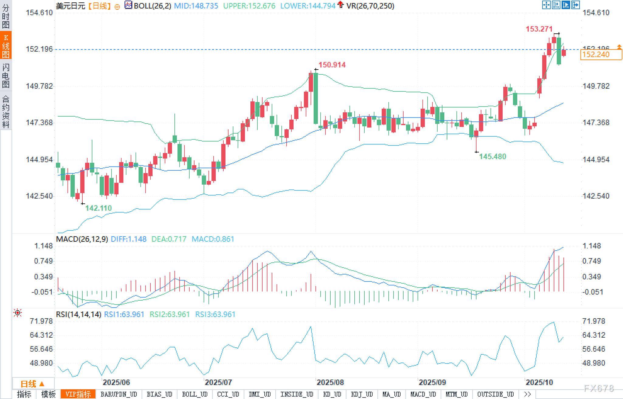 周一(10月13日),美元兑日元欧洲时段维持“偏强—反复”的拉锯节奏,围绕152.00上方震荡。受日本与美国同步假期影响,流动性偏薄,细小的订单也能推动较大的价格波动,汇价数次逼近上方密集区后未能有效扩展涨幅,技术与基本面正在展开微妙博弈。 ![]() 市场把重点放在三条线索上:第一,市场更相信日本央行(BoJ)或进一步延后加息时点,日元“利差劣势”加深;第二,外部风险偏好回暖——尤其是华府最新对外关税政策口径的转向——削弱了日元作为避险货币的吸引力;第三,干预阴影持续盘桓。近期当局被认为随时可能出手阻止日元进一步贬值,这种“悬而未决”让空头不敢无序追加仓位,形成典型的上攻放缓、波动加大。 与之相对,美国方面出现两股相互牵制的力量。一方面,市场普遍接受美联储年内仍可能再降息两次的路径,名义利差的边际回落按理说应当压制美元多头;另一方面,美元在上周五的回撤后迅速重拾动能,即便面对降息定价与财政僵局延长的双重不利,美元指数依旧表现出较强的“逢低承接”。 此外,美国政府自10月1日起的停摆进入第三周,预算僵局迟迟未解,并已出现联邦雇员的首次裁减通报。常规情况下,这类“政策不确定+增长拖累”的组合会让美元处于防守姿态。然而现实交易中,市场在风险资产反弹时选择抛售日元,在现金需求升温时又愿意抱住美元,形成对美元兑日元的“单边倾斜”。因此,基本面的净效应是:日元受压、美元韧性犹存,但干预威慑让上行每前进一步都需付出更高的波动成本。 技术面: 当前日线图上,布林中轨位于148.735,上轨152.676,下轨144.794。汇价运行在中轨之上、上轨之下,属于典型的“强势通道内高位整理”。近期高点153.271标注清晰,前期强势峰值150.914为重要回撤参照;更下方的阶段性低点分别为145.480与更早的142.110。就动量结构而言,MACD(26,12,9)显示DIFF=1.148高于DEA=0.717,柱状图为0.861,处于正值扩张区间,说明中期多头动能仍在释放但已接近前期峰值区域;RSI(14)读数约63.961,位于多头区而未触及典型超买阈(70附近),提示“强势但不极端”。 ![]() 后市展望: 短线(1—3个交易日):若汇价以阳线实体有效收在152.676之上,并伴随MACD柱状图继续放大,则153.271将再被挑战,届时一旦出现“上破—回测—再上”的三步确认,短线趋势可延伸;若多次触碰152.676未能站稳且回落至152.00之下,则将进入“高位震荡—回撤”阶段,先看150.914的支撑弹性,进一步回落则观察148.735(布林中轨)的多空分水岭。考虑到干预不确定性,高位长上影与快速回吐的概率上升,价位穿越需以日收盘为准来判读“真假突破”。 |