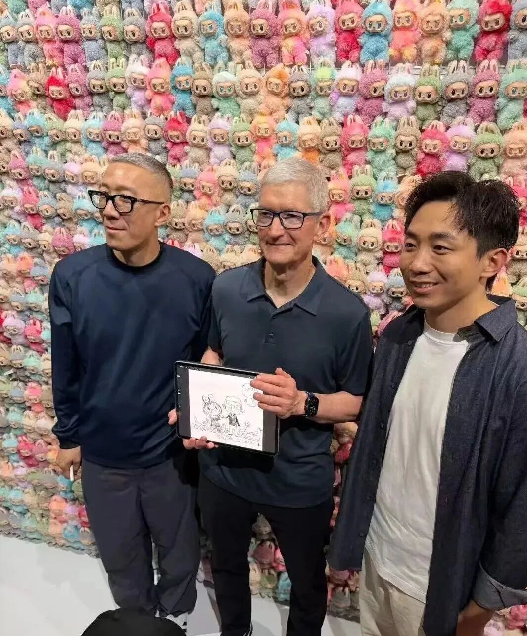 科技博主Eva报道,在巡展期间,龙家升向库克展示了他的创作灵感及不同的艺术作品,同时介绍了Labubu家族的创作背景。有趣的是,在满墙的Labubu面前,艺术家龙家升展示了如何用iPad Pro进行绘画创作。