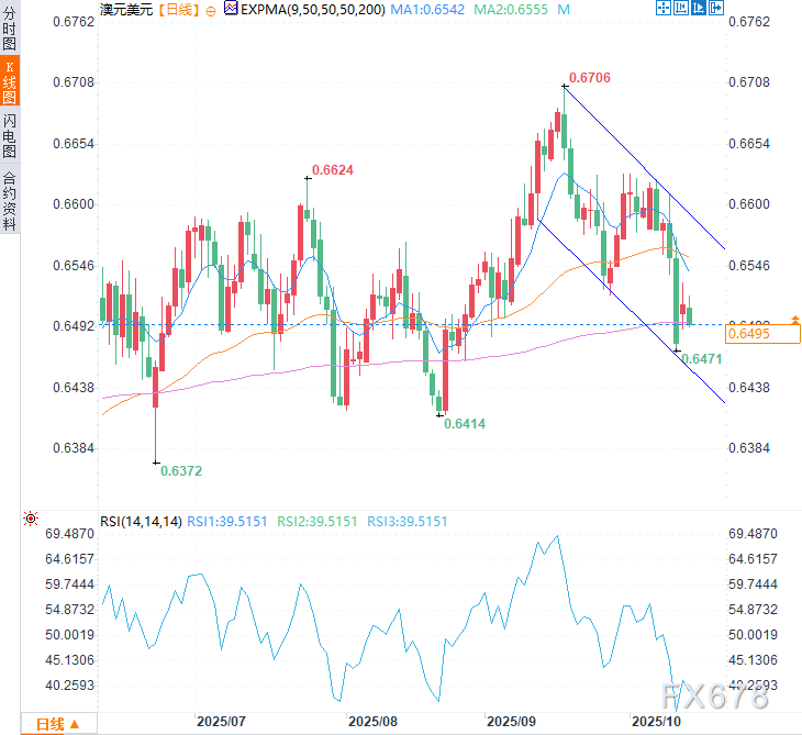 周二(10月14日)亚市时段澳元兑美元走低。澳洲联储公布9月货币政策会议纪要后,澳元未受到提振,反而市场谨慎情绪为美元提供支撑。纪要显示理事会成员一致认为当前政策仍略显紧缩,但难以精确评估紧缩程度。 ![]() 上周澳洲联储主席米歇尔·布洛克强调服务业通胀仍具粘性后,市场情绪保持谨慎。她承认第二季度通胀略超预期,但强调通胀正持续朝着正确方向回落。 澳大利亚10月消费者通胀预期从先前的4.7%升至4.8%,创6月以来最高水平。市场对第三季度通胀可能超预期的担忧加剧,这强化了澳洲联储维持谨慎政策立场的预期。 市场普遍预计,在9月将官方现金利率维持在3.6%不变后,澳洲联储将继续按兵不动。 美联储主席鲍威尔讲话前美元持稳 美元指数目前持稳,现交投于99.20附近。市场正密切关注美联储主席杰罗姆·鲍威尔将于今日晚些时候发表的讲话。 根据CME FedWatch工具显示,市场目前预计美联储10月降息的概率高达97%,12月再次降息的概率为92%。 费城联储主席安娜·保罗森周一表示,就业市场风险上升支持美联储进一步降息,因为关税措施目前看来不太可能如预期般推高通胀。 9月联邦公开市场委员会会议纪要表明,政策制定者倾向于今年进一步降息。多数政策制定者支持9月降息,并暗示今年晚些时候将进一步放松政策。然而部分成员主张采取更谨慎的态度,理由是对通胀的担忧。 美国总统特朗普上周五称,没有必要在两周后于韩国举行的峰会上与中国领导人会晤,并宣布计划对中国进口商品征收100%关税。但周日他在Truth Social平台发表缓和言论,表示中国经济“将会好转”,美国希望“帮助中国而非伤害中国”。 澳大利亚总理部门泄露的简报显示,政府官员已开始与矿商商讨共同建立12亿澳元(7.7628亿美元)的“关键矿产战略储备”。根据拟议中的美澳资源协议,澳大利亚正考虑为关键矿产设定最低价格,并为新稀土项目提供资金支持。 技术分析 日线图技术分析显示,由于澳元兑美元在下降通道内持续走低,整体趋势仍偏向看跌。 14日相对强弱指数(RSI)持续位于50中性线下方,强化了看跌前景。 下行方面,澳元兑美元可能下探下降通道下轨0.6460附近。若有效跌破该通道下轨,将巩固看跌趋势,推动汇价测试8月21日创下的四个月低点0.6414,继而下探五个月低点0.6372。 上行方面,初始阻力位见于9日指数移动平均线0.6542,随后是50日指数移动平均线0.6555。若能突破这些均线阻力,将改善中短期价格动能,推动澳元兑美元上探下降通道上轨0.6600附近。若进一步突破通道上轨,则看涨趋势将开始显现,支撑汇价上探9月17日创下的12个月高点0.6707附近。 ![]() 北京时间11:54,澳元兑美元交投于0.6496/97。 |