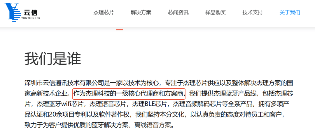 且据Internet archive回溯科普豪官网,科普豪自称是杰理科技的方案商及核心代理商情形,最早可追溯至2022年2月4日。 可见,杰理科技方案商大客户科普豪在其官网自称系“杰理”代理商,而杰理科技却称其方案商客户不属于经销商或代理商。 除以上2家方案商大客户外,另有2家公司自称系杰理科技的一级代理商。 据深圳市云信通讯技术有限公司(以下简称“深圳云信”)官网,截至查询日2025年10月13日,深圳云信自称为杰理科技的一级代理商和方案商。2019年代理杰理全系列芯片,获得杰理一级代理商资质。