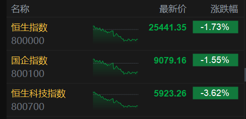 格隆汇10月14日|经贸摩擦升级致风险市场持续承压,港股三大指数高开低走呈单边下跌行情,且午后开盘加速走低。截止收盘,恒生科技指数跌幅最大,收跌3.62%失守6000点大关,恒生指数、国企指数分别下跌1.73%及1.55%,恒指报25441点,国指险守9000点关口。