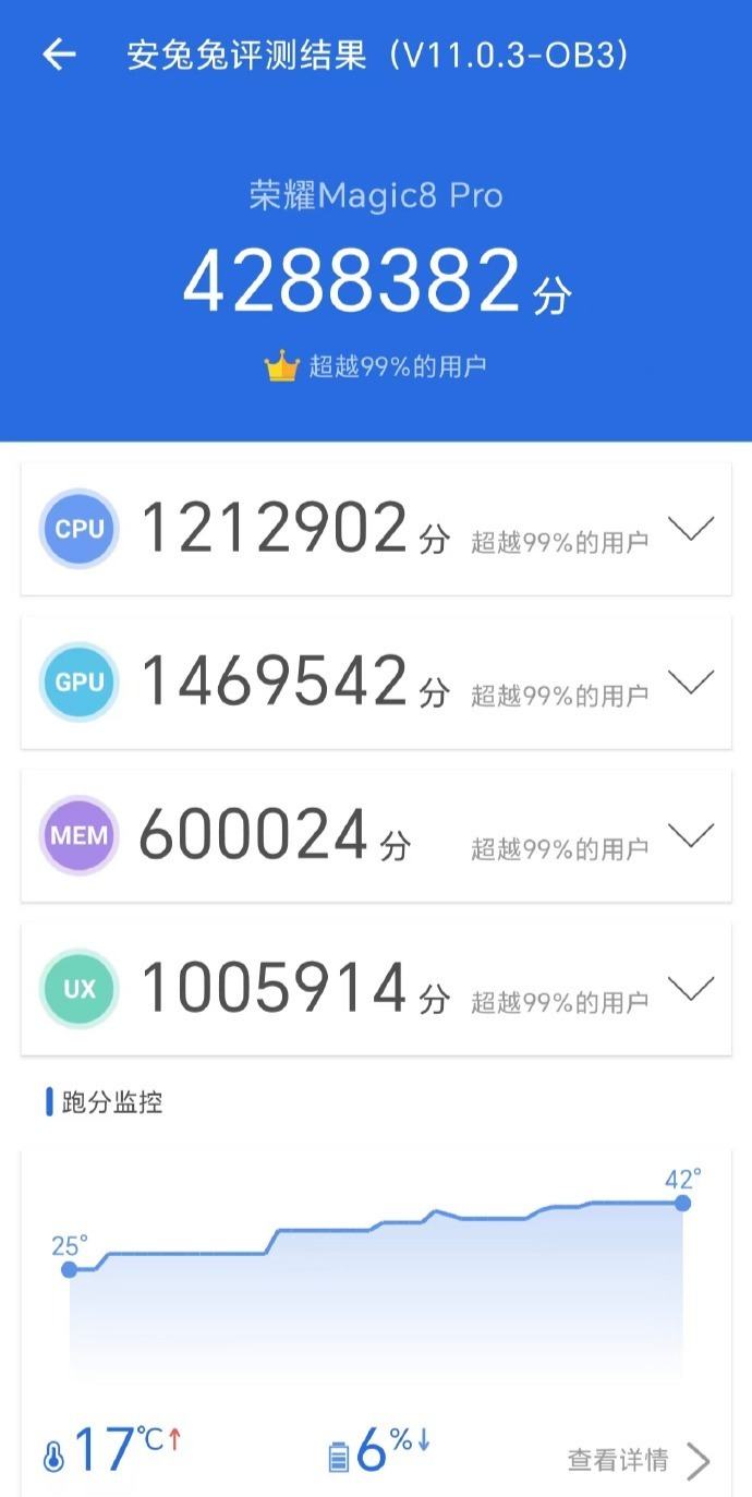 凤凰网科技讯 10月14日,荣耀终端股份有限公司旗舰手机产品经理李坤发文称,荣耀Magic8 Pro的最新跑分是428万。