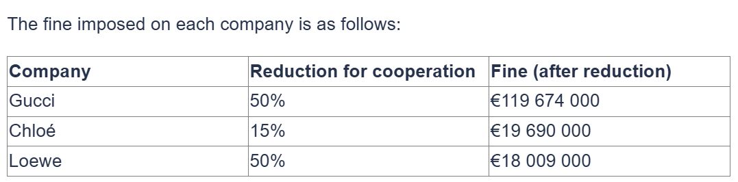 欧盟委员会在声明中解释了处罚的主要理由:“这三家时尚企业干预其零售商的商业战略,对零售商施加种种限制,如要求不得偏离建议零售价、最高折扣率和指定促销期。”欧盟委员会说,上述违法行为存在于整个欧盟范围并持续了几年,“抬高了价格,缩小了消费者的选择范围”。 欧盟委员会执行副主席特雷莎·里韦拉说,处罚决定“向时尚行业及其他领域发出强烈信号,即我们不会容忍欧洲出现这种操作,公平竞争和消费者保护原则平等适用于所有人”。 欧盟委员会2023年4月对这三家企业发起突击搜查,次年7月正式启动反垄断调查。三家企业均承认其行为违法并配合调查,从而换取欧盟调低罚款额。 古驰、蔻依、罗意威分别被罚1.197亿欧元、1970万欧元和1800万欧元。这三家公司总部分别位于意大利、法国和西班牙,分属法国开云集团、瑞士历峰集团、法国路威酩轩集团旗下。