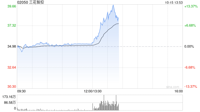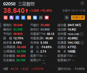 三花智控港股午后拉升涨超10%,报价38.64港元,A股触及涨停。