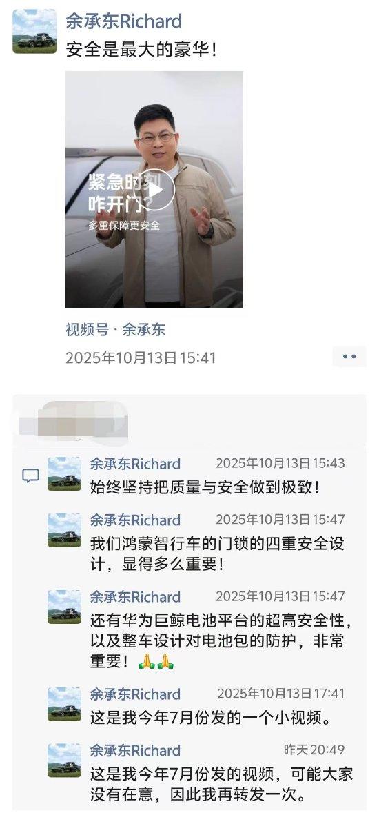 仟茂科技讯 10月15日下午消息,近日,华为常务董事、终端BG董事长余承东在朋友圈发文强调,“安全是最大的豪华!”配文下方,他还引用了今年7月发布的一个紧急时刻如何开车门的视频。 该视频演示了紧急时刻下,如何在鸿蒙智行车内打开车门。同时,他还提到了碰撞解锁冗余模块,展示了鸿蒙智行车在门锁安全上的设计。余承东在视频中强调,对于安全,备份再多也不嫌多。 在评论区,他进一步补充道,“始终坚持把质量与安全做到极致!我们鸿蒙智行车的门锁的四重安全设计,显得多么重要!还有华为巨鲸电池平台的超高安全性,以及整车设计对电池包的防护,非常重要!”