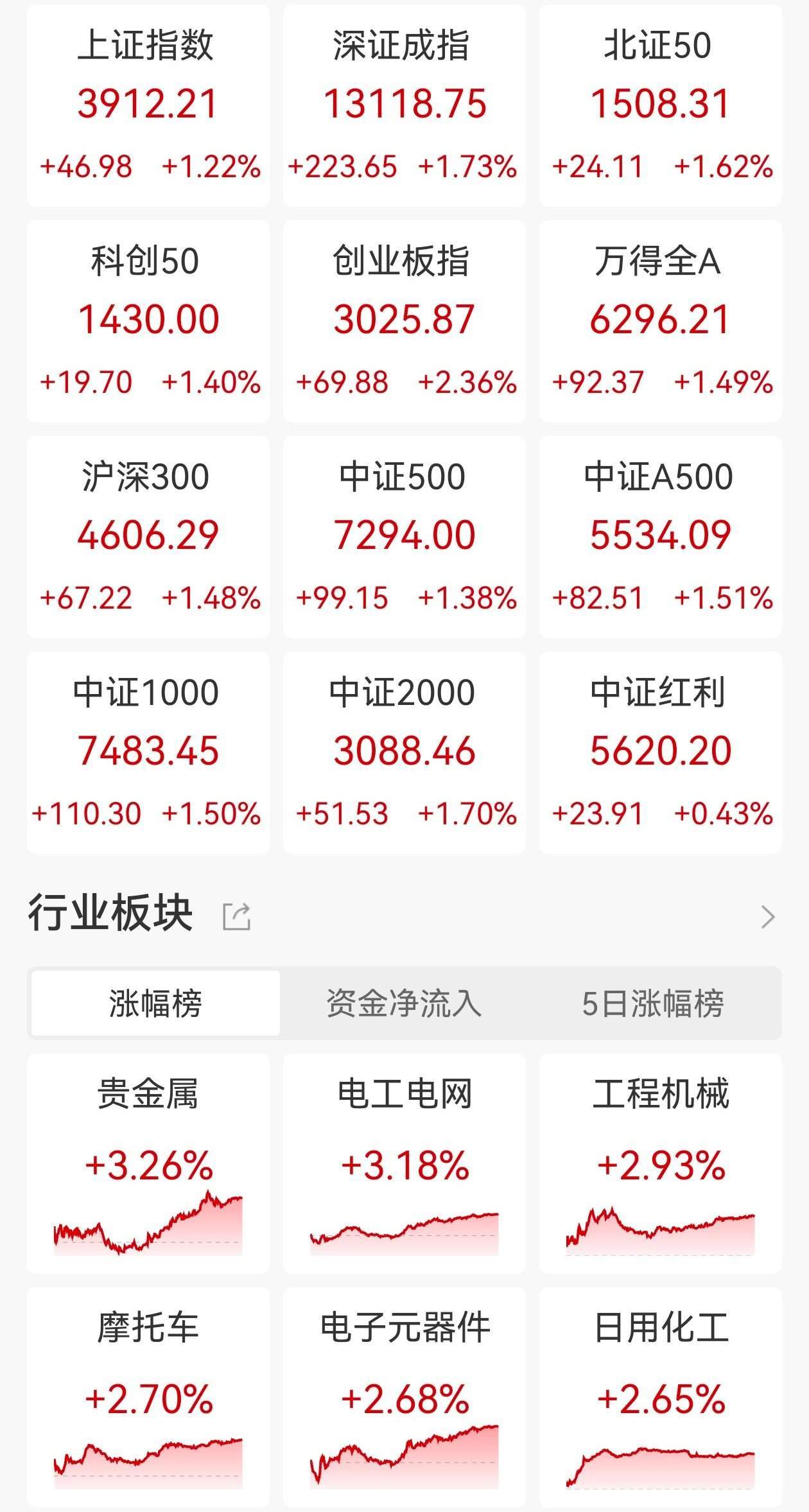 格隆汇10月15日|A股主要指数今日早盘小幅震荡,午后拉升上涨;截至收盘,沪指涨1.22%报3912点,深证成指涨1.73%,创业板指涨2.36%。全市场成交额2.09万亿元,较前一交易日缩量5062亿元,超4300股上涨。