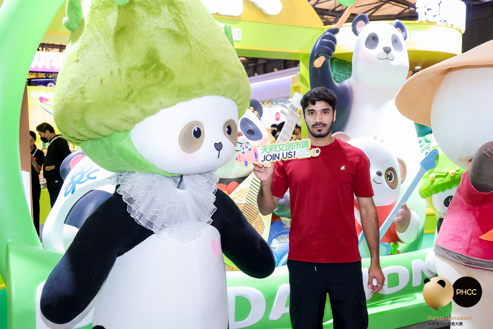 展览现场 展台内部,观众流连于各个产品陈列区。百余款涵盖潮玩、金融收藏品、美学生活、文具办公等全品类的首发产品,如同一个微缩的熊猫创意宇宙。一位年轻女孩正小心翼翼地将一款“辛尼”系列的水晶摆件对着灯光端详,光影透过切割面,折射出斑斓的色彩,映照在她欣喜的脸上。“它不像传统的熊猫形象,更有设计感和艺术性,放在家里绝对是点睛之笔。”她对同伴说道。 展览现场也吸引了不少外国观众,他们被“熊猫家园”琳琅满目的产品吸引。来自巴基斯坦的法哈德看到熊猫人偶后走上前与之合影、拥抱,他惊呼:“太有趣了,这些熊猫人偶都很可爱。”来自美国的亚历山大很喜欢熊猫赤竹侠金融文创,他直言这些文创产品都很精美,置身于展览现场,仿佛到了成都。