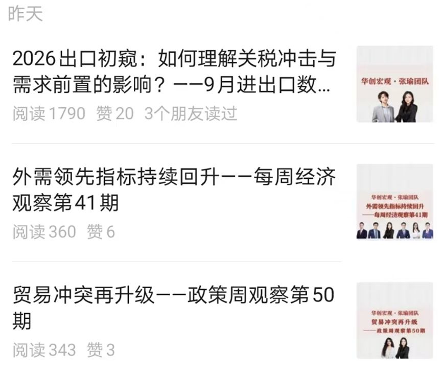 截图自:微信公众号“一瑜中的” 值得一提的是,昨日深夜,张瑜的微信公众号一连发了三篇文章,均为其团队最近发布的研究报告。其中,头条文章解读了最近发布的进出口数据。《2026出口初窥:如何理解关税冲击与需求前置的影响?——9月进出口数据点评》一文指出,“在8月7日新版对等关税生效以后,9月中国出口大超预期,虽然客观有低基数(9月出口环比与历史同期均值基本持平,两年平均同比5.3%低8月6.5%)和工作日天数增加等因素的影响,但与此同时中国PMI新出口订单指数于9月升至近五年同期最高,也彰显了出口韧性。” 券商首席成座谈会“常客”记者根据公开信息不完全统计发现,近年来,总理座谈会上频频出现来自券商这样的市场机构的经济学家已成常态: 1、2025年4月9日,李强总理主持召开经济形势专家和企业家座谈会,中泰证券首席经济学家李迅雷在座谈会上发言。与会专家就应对外部冲击、推动经济持续向好提出意见建议。 2、 粤开证券首席经济学家罗志恒参加2024年10月8日李强总理主持的经济形势专家和企业家座谈会。与会专家就推动经济持续回升向好提出意见建议。 3、平安证券首席经济学家钟正生曾参加2024年7月9日李强总理主持召开的经济形势专家和企业家座谈会。与会专家就解决当前经济运行中的矛盾问题提出了意见建议。 4、长江证券首席经济学家伍戈、中金公司首席经济学家彭文生曾参加2024年4月8日李强总理主持召开的经济形势专家和企业家座谈会。与会专家从不同角度分析了当前经济运行中存在的矛盾和问题,并对进一步完善宏观政策、做好经济工作提出了意见建议。 5、原光大证券首席宏观经济学家高瑞东曾出席2023年10月13日李强总理主持召开的经济形势专家和企业家座谈会。与会专家就解决当前经济运行中的问题和做好明年经济工作提出了意见建议。 6、粤开证券首席经济学家罗志恒、原国金证券首席经济学家赵伟共同出席2023年7月6日李强总理主持召开的经济形势专家座谈会。与会专家就解决好经济运行中的问题提出了意见建议。 此外,多年前,国投证券首席经济学家高善文、原中信证券首席经济学家诸建芳、瑞银首席中国经济学家汪涛、原银河证券首席经济学家左小蕾等也曾参加过此类由国务院总理主持的座谈会。 值得关注的是,李迅雷、罗志恒等有几位券商首席近年来曾多次应邀参加座谈会。某券商首席今日告诉记者,“据我了解,存在一种首席经济学家的定期研讨机制,频率可能是每个季度一次,这也是决策层和市场沟通的一种方式,属于预期管理机制的一部分。” 而在某头部券商首席看来,券商的首席经济学家受邀请参加总理座谈会,能增强建言的广泛性,另外,每次座谈会具体邀请谁可能也和要讨论的议题有关系。 那么,来自券商的经济专家面向决策层进行建言能在中国经济运行中发挥何种作用? 对此,曾参加过总理座谈会的中银证券全球首席经济学家管涛之前在接受记者采访时曾表示,“第一,政府部门内部研究机构主要服务于本部门,而市场机构研究面向大众,客观中立特征明显,二者定位有所不同。其次,市场机构贴近市场,对市场运行规律及具体情况,或者某个具体环节了解更多,很多市场机构专家在某一小众领域长期做专项研究。政府广开言路,可以帮助其更好决策。另外,在一线实操层面,市场机构能够体会到某一政策是否切实可行,以及对行业正面、负面的影响有多大,对政策制定从另一侧面提供帮助。政府部门的优势是对政策了解更多、情况掌握更全面、站位更高,但由于并不接触具体业务,在操作环节可以征询市场机构专家的意见。” |