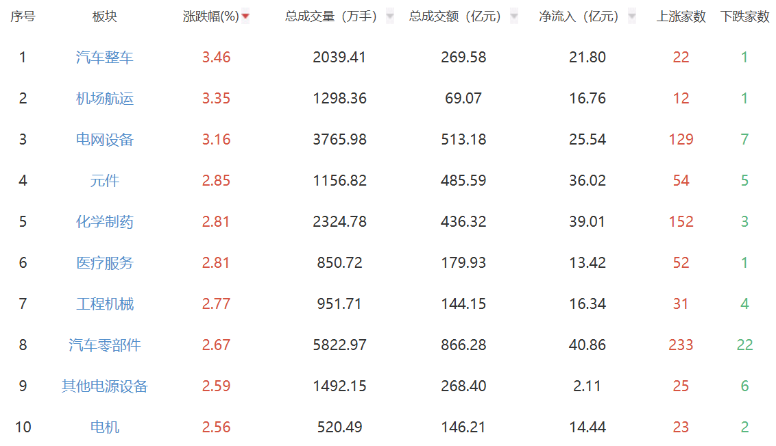 中国经济网北京10月15日讯 A股三大指数今日集体上涨,截至收盘,上证综指报3912.21点,涨幅1.22%,成交额9615.52亿元;深证成指报13118.75点,涨幅1.73%,成交额11113.06亿元;创业板指报3025.87点,涨幅2.36%,成交额4886.36亿元。 板块方面,汽车整车、机场航运、电网设备等板块涨幅居前,港口航运、小金属、种植业与林业等板块跌幅居前。 A股市场板块涨跌幅排行