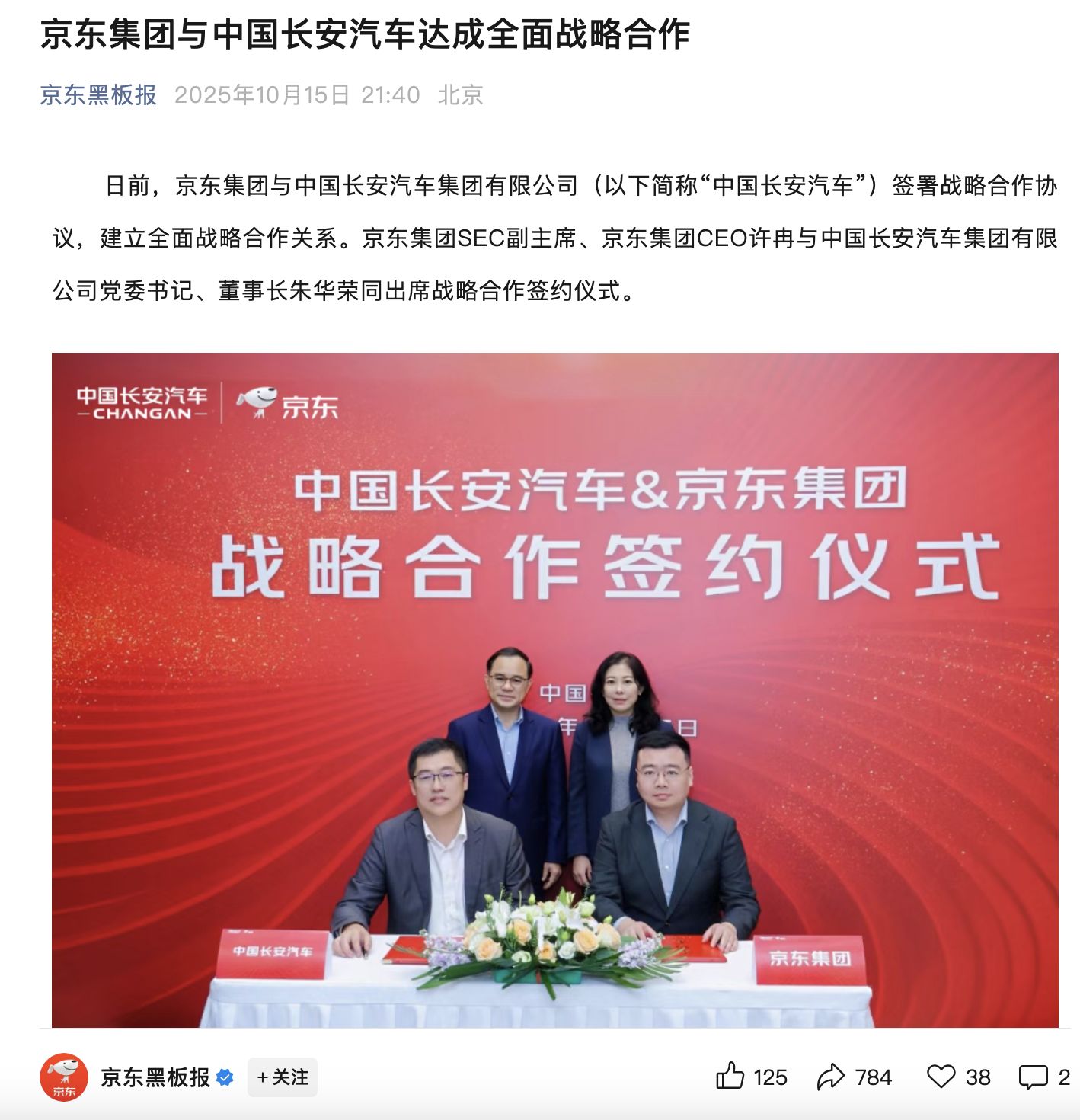 每经编辑|黄胜 据公众号“京东黑板报”15日消息,长安汽车集团与京东集团在北京签署战略合作协议,建立全面战略合作关系。长安汽车旗下五大品牌阿维塔、深蓝汽车、长安启源、长安汽车、长安凯程与京东集团旗下京东零售、京东物流等板块签署合作协议。未来,长安汽车与京东集团将共同探讨城市智慧物流车辆等智能硬件与智能运营系统建设,联合开展新能源无人智能化车型的设计与开发、生产等。