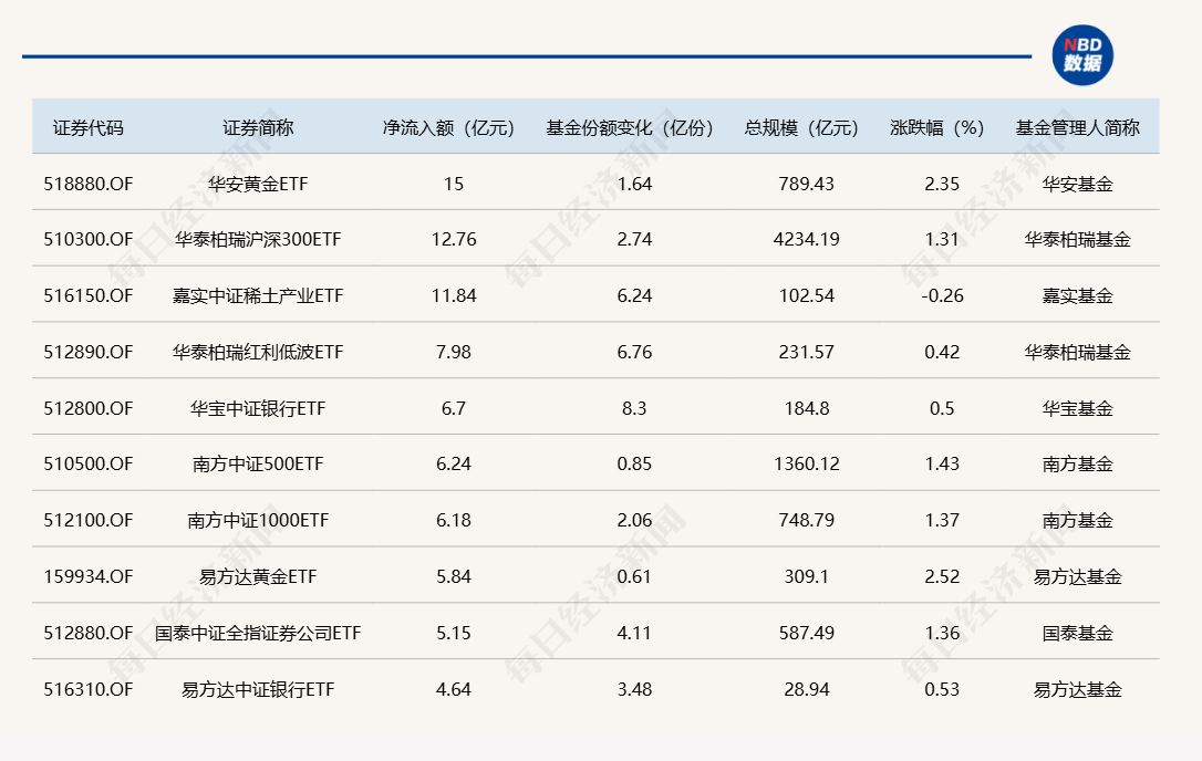 每经记者|肖芮冬 每经编辑|赵云 昨日市场探底回升,沪指涨超1%重回3900点,创业板指探底回升涨超2%。板块方面,汽车、电网设备、医药等板块涨幅居前,港口航运、光刻机等板块跌幅居前。 Wind数据显示,在10月15日非货币ETF市场中,华安黄金ETF基金份额增加1.64亿份,净流入额为15.00亿元;华泰柏瑞沪深300ETF基金份额增加2.74亿份,净流入额为12.76亿元;嘉实中证稀土产业ETF基金份额增加6.24亿份,净流入额为11.84亿元。
