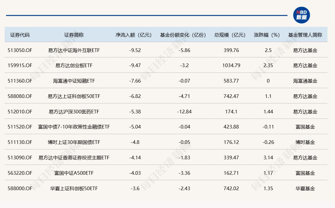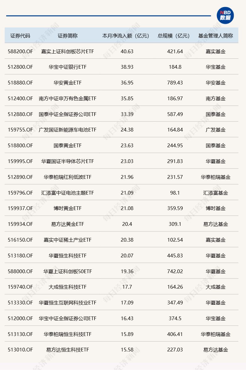 与此同时,易方达中证海外互联ETF基金份额减少5.86亿份,净流出额为9.52亿元;易方达创业板ETF基金份额减少3.2亿份,净流出额为9.47亿元;海富通中证短融ETF基金份额减少0.07亿份,净流出额为7.66亿元。 截至10月15日,本月资金净流入额居前20的ETF名单如下: