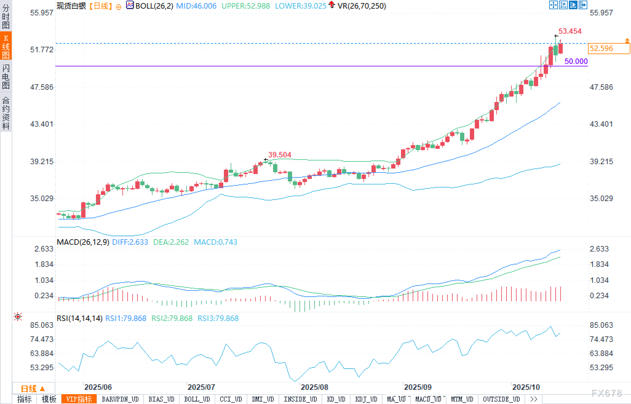 周三(10月15日),现货白银北美时段围绕52.50美元交投,日内涨幅逾2.0%,基本收复前一日回撤;此前价格在日线图上刷新历史高位至53.454美元后快速回落,四连阳被打断,但多头底盘并未松动。 ![]() 伦敦实物市场持续偏紧,库存降至历史低位,形成典型的短线挤压结构。现货可借铸造物料有限,借入成本与租借利率上行,精炼商与ETF托管方加速“抢货”,抬升即期升水并通过融资链条放大价格弹性。供需错配直接推高伦敦现货—美盘期货的基差,局部时段出现罕见的现货溢价扩张,市场将其解读为“系统性压力”信号。短缺不仅改变了现货的边际定价,也迫使空头——尤其是对冲盘与期限错配盘——主动回补,从而把上涨转换为“逼空—追价—再逼空”的反馈链条。 中期展望上,几家机构的修正提供了锚点:某大行将2026年目标上调至每盎司65美元,理由是结构性缺口加深与配置需求延续;另一家国际银行把2025年均价上调至38.56美元,强调光伏、电动车、半导体等行业的韧性。宏观层面,美元强势边际放缓:财政端不确定性延长,潜在的政府停摆被押注为“史上最长之一”,情绪对美元并非单向正向;同时,最新美联储沟通偏鸽,主席在业内年会上指出经济展望较上次会议变化不大、劳动力市场趋弱已引发9月的25bp降息,即便“停摆”,评估仍会推进。点阵图给出年内两次降息的中位路径,主流观点倾向在10月与12月分别落实;基线情形下,明年再降75bp,至2026年9月终端上限3.00%。名义与实际利率下行预期叠加,使贵金属贴现负担变轻,与“实物紧缺—价差扩张”的供给侧逻辑形成共振。 技术面: 日线K线图给出一致的趋势信号。第一,布林带明显扩张,布林中轨46.006,布林上轨52.988,最新价沿上轨外沿爬升,表明上升趋势动能饱满,但短线“超涨”压力在积累。 ![]() 第三,MACD(26,12,9)显示DIFF=2.633、DEA=2.262,正向开口扩大,MACD柱状图0.743且抬升,动量未现顶背离,趋势仍在推进。第四,就水平价位而言,53.454为近端历史高点与即时阻力;52.988(布林上轨)为动态阻力;51.772为前期密集成交区的水平转化区;50.000为显著整数关口与静态支撑;向下依次关注46.006(布林中轨,趋势性支撑)与39.025(布林下轨,极限波动带)。在“沿轨上行”格局未被破坏前,回撤若止步于上轨—中轨区间,可视作对趋势线的健康回测;反之,若有效跌破中轨并伴随MACD死叉,日线级趋势扭转的概率才会显著上升。 市场情绪观察 当前情绪结构的核心是“踏空—补仓—再踏空”的群体心理。伦敦现货端的供给“天花板”令做空持仓面临期限错配,一旦价格突破前高,追保与止损触发的链式反应会显著放大波动率。这种量能前导式行情,在贵金属周期里常见两种延伸路径:其一“量价齐升+布林带扩张”,形成持续上攻;其二快速上冲后出现“乌云盖顶/黄昏之星”等反转K线,转入高位箱体或回撤。 与此同时,现货—期货价差抬高“交易对手风险”,部分对冲盘被迫收缩杠杆,进一步放大现货升水的黏性。这解释了为何在四连阳被打断后,价格仍能迅速修复至52上方。情绪的另一端,是对美联储宽松路径的“前置定价”:当市场把降息从“可能”切换到“基本确定”,资金常提前兑现贵金属的贝塔,而对落地时点的意外会带来二次波动。于是,短期“超买+拥挤”并存,行情节奏大概率在强趋势与剧烈振荡之间切换。 |