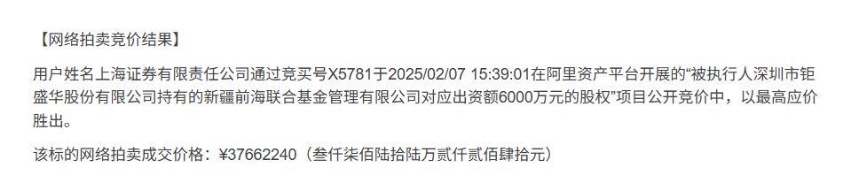 公开信息显示,新疆前海联合基金成立于2015年8月7日,是证监会批准成立的国内第99家基金管理公司。公司总部位于广东省深圳市,注册资本金2亿元。 在此次变更之前,新疆前海联合基金的股东结构为:深圳市钜盛华股份有限公司(30%)、深圳粤商物流有限公司(25%)、深圳市深粤控股股份有限公司(25%)、凯信恒有限公司(20%)。 其中,深圳市钜盛华股份有限公司持有的这部分股权,此前曾多次出现在拍卖平台上。今年2月份,上海证券以3766万元的价格拍下该部分股权。