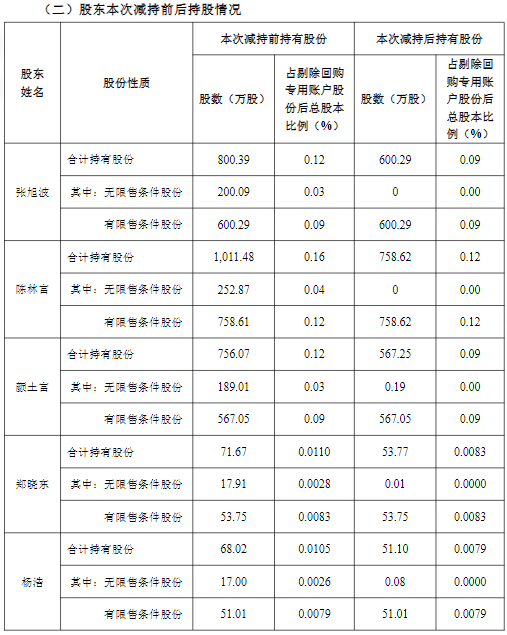 (图片来源:截图自利欧股份公告) 结合持股股份的性质来看,上述5人基本上将持有的无限售条件股份都卖完了。具体来看,董事会秘书张旭波减持200.09万股,减持后无限售条件股份数量为零;原董事陈林富减持252.86万股,减持后无条件限售股份数量为零;副总经理颜土富减持188.82万股,减持后无限售条件股份数量仅有0.19万股;副总经理郑晓东减持17.90万股,减持后无条件限售股份数量为0.01万股;财务总监杨浩减持16.92万股,减持后无条件限售股份数量为0.08万股。