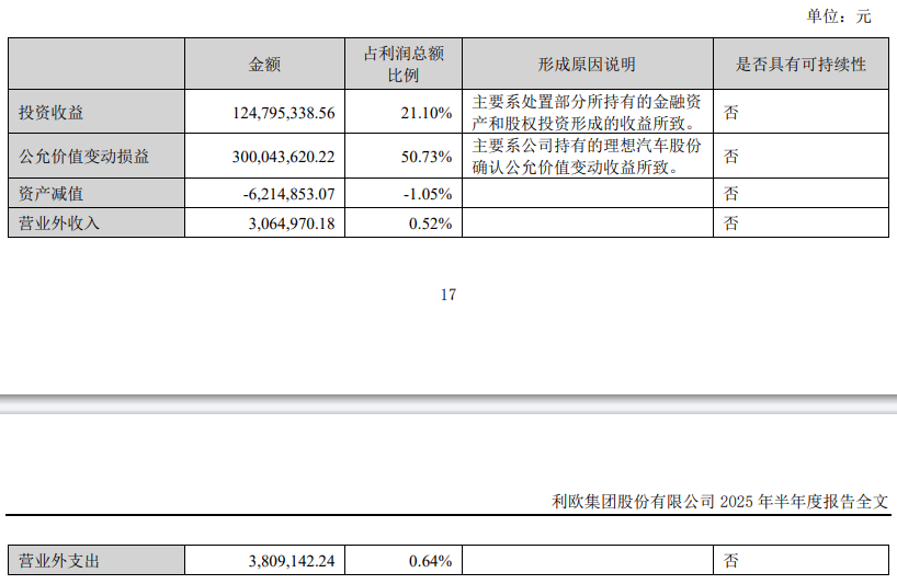 (图片来源:截图自利欧股份公告) 公开资料显示,利欧股份主营业务分为机械制造业务和数字营销业务两部分。2024年,利欧股份业绩整体表现不如人意,净利润为亏损2.59亿元。不过2025年上半年,公司净利润实现反转,达到4.78亿元。不过,利欧股份的净利润大部分是由投资收益和公允价值变动损益带来的,2025年上半年,其公允价值变动带来的收益超过3亿元,投资收益约为1.25亿元。