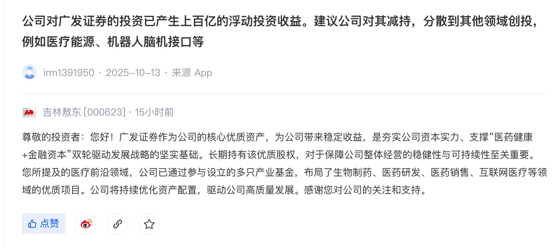 每经记者|陈晨 每经编辑|彭水萍 10月15日,广发证券公告其7.61亿元的中期分红方案即将进入实施阶段,再度将市场的目光聚焦于券商行业日益增强的股东回报意识。 此外,就在大额现金红利即将到账之际,其第一大股东吉林敖东却对投资者提出的减持建议明确说“不”,直言广发证券是其“核心优质资产”。 广发证券的分红动作,正是2025年上市券商行业分红潮的缩影——东方财富Choice数据显示,A股43家上市券商中28家推出中期分红预案,合计分红约188亿元,同比增长超40%,行业分红稳定性与持续性显著提升。值得注意的是,这28家中,山西证券、财达证券、华西证券、华安证券是首次加入中期分红阵营。 广发证券7.61亿元分红落地在即根据广发证券10月15日发布的公告,公司2025年度中期A股利润分配方案已进入倒计时。本次分红的股权登记日定于10月21日,现金红利则将于次日(10月22日)正式发放。此前方案显示,广发证券以其76.06亿股的总股本为基数,向全体股东每10股派发现金红利1元(含税),合计分配的现金红利总额达到7.61亿元。此次分红金额占公司2025年上半年归属于母公司股东净利润的11.76%。 需要强调的是,作为A+H两地上市的券商,广发证券此次分红需兼顾不同市场股东。公告显示,其总股本中A股为59.04亿股,H股为17.02亿股。针对H股股东,公司将把现金红利折算为港元派发。 进一步梳理股东结构可见,广发证券的分红将主要惠及三大长期股东。截至2025年6月30日,吉林敖东及其一致行动人持有广发证券20.11%股权,辽宁成大及其一致行动人持股17.97%,中山公用及其一致行动人持股10.57%,三者合计持股超48%,为公司前三大股东。 按此次7.61亿元分红总额计算,三大股东将分别获得1.53亿元、1.37亿元、0.8亿元现金红利,合计约3.7亿元。值得一提的是,这三家公司26年来一直位列广发证券前三大股东,形成了稳固的“铁三角”关系。 有趣的是,就在这笔可观的投资收益即将兑现的时刻,一场围绕“是否应减持”的讨论在投资者与股东之间展开。有投资者向吉林敖东建议,可考虑适时减持部分广发证券股权。