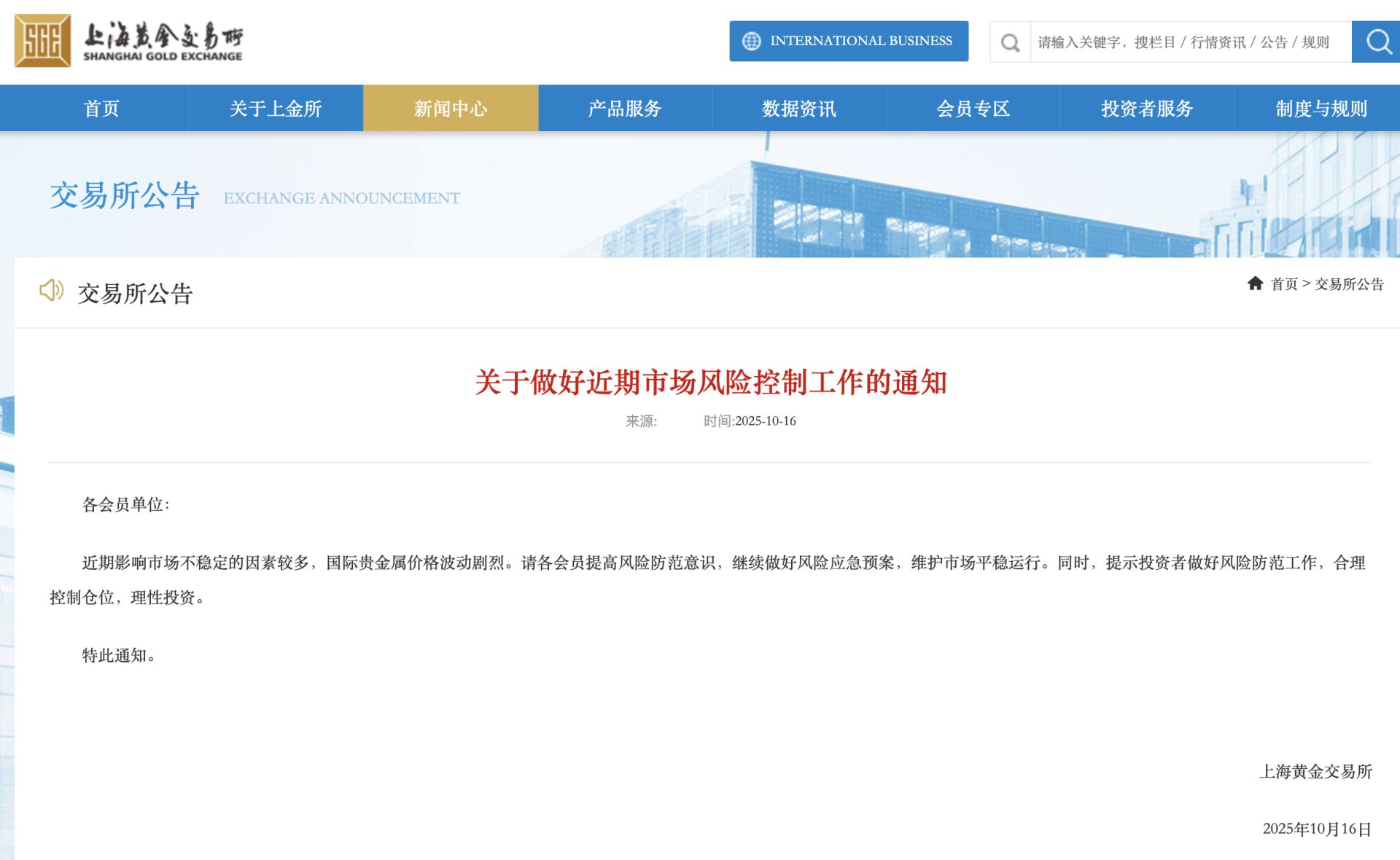 针对近期国际贵金属价格波动剧烈,上海黄金交易所10月16日向各会员单位发布关于做好近期市场风险控制工作的通知。 近期影响市场不稳定的因素较多,国际贵金属价格波动剧烈。请各会员提高风险防范意识,继续做好风险应急预案,维护市场平稳运行。同时,提示投资者做好风险防范工作,合理控制仓位,理性投资。