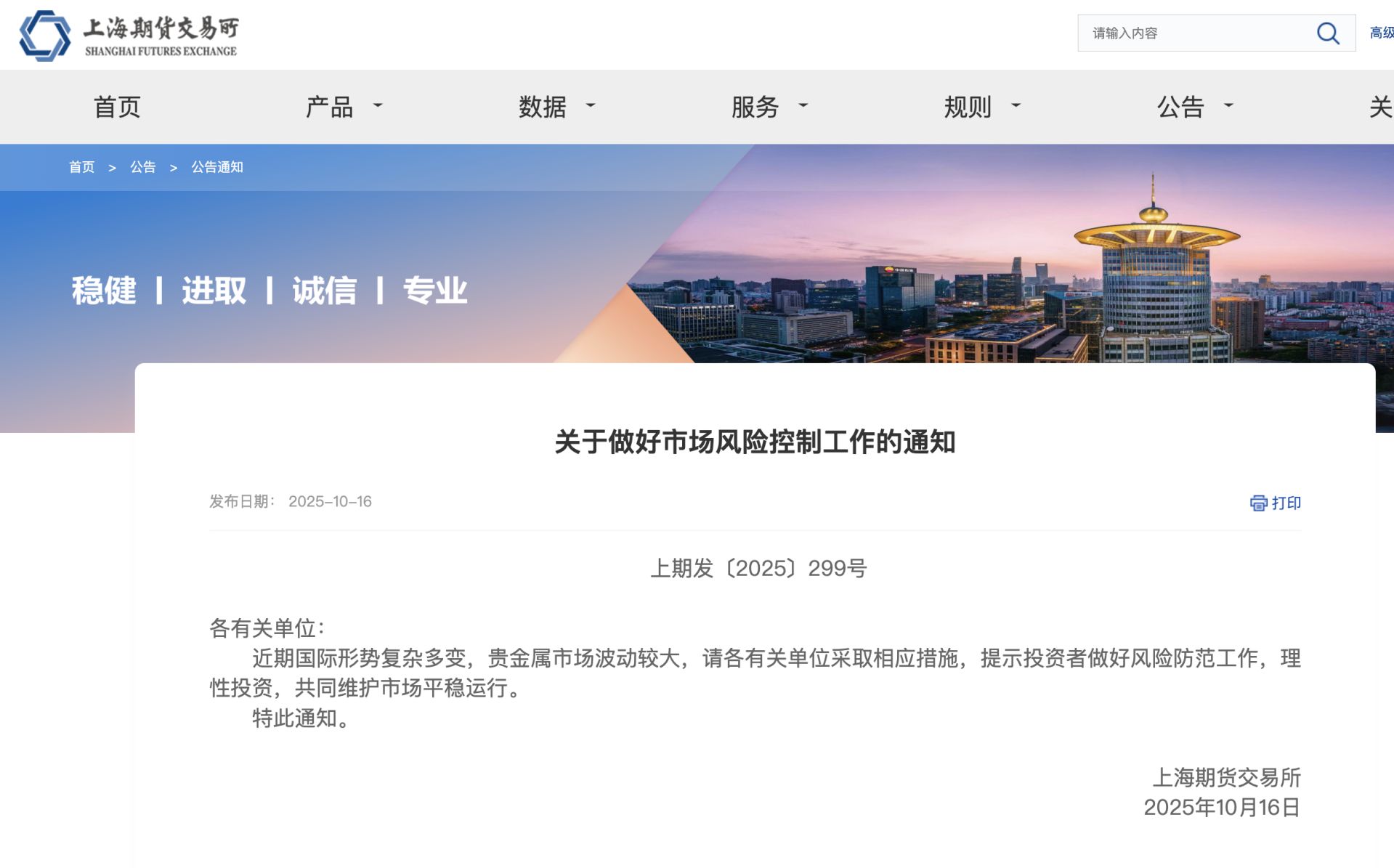 同一天,上期所发布通知,近期国际形势复杂多变,贵金属市场波动较大,请各有关单位采取相应措施,提示投资者做好风险防范工作,理性投资,共同维护市场平稳运行。