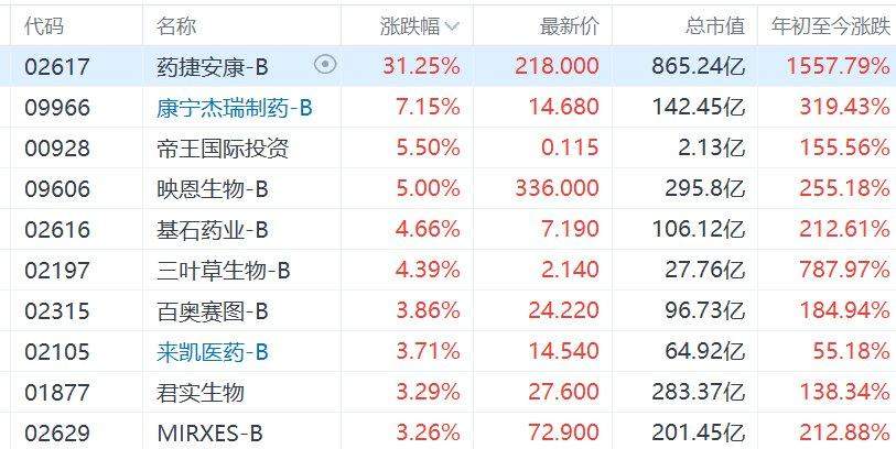 格隆汇10月17日|港股市场生物科技股今日再度集体逆势走强,其中,药捷安康-B飙升超30%,康宁杰瑞制药-B涨超7%,帝王国际投资、映恩生物-B涨超5%,基石药业-B、三叶草生物-B涨超4%。