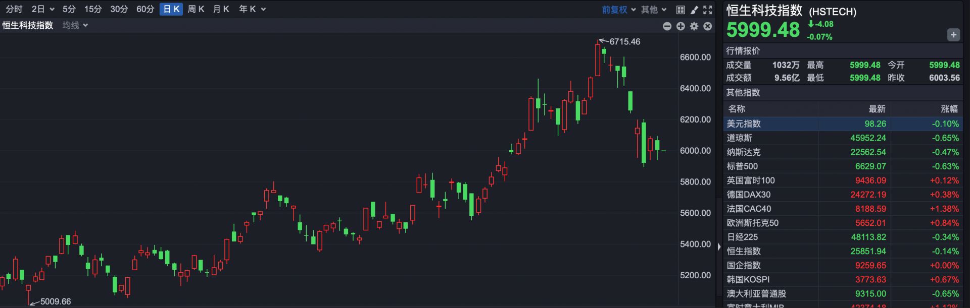 恒生科技指数报5999.48点,下跌4.08点,下跌0.07%。