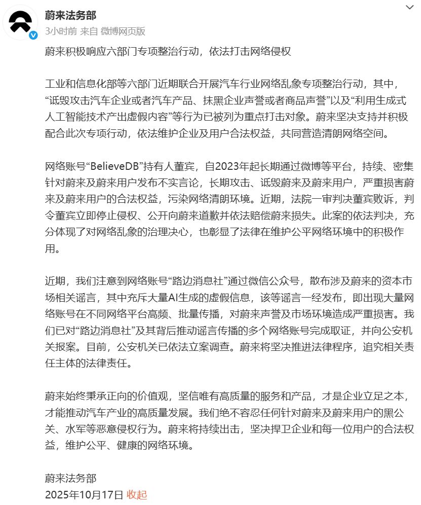 每经编辑|张锦河 10月17日,蔚来法务部发文称,工业和信息化部等六部门近期联合开展汽车行业网络乱象专项整治行动,其中,“诋毁攻击汽车企业或者汽车产品、抹黑企业声誉或者商品声誉”以及“利用生成式人工智能技术产出虚假内容”等行为已被列为重点打击对象。蔚来坚决支持并积极配合此次专项行动,依法维护企业及用户合法权益,共同营造清朗网络空间。 网络账号“BelieveDB”持有人董宾,自2023年起长期通过微博等平台,持续、密集针对蔚来及蔚来用户发布不实言论,长期攻击、诋毁蔚来及蔚来用户,严重损害蔚来及蔚来用户的合法权益,污染网络清朗环境。近期,法院一审判决董宾败诉,判令董宾立即停止侵权、公开向蔚来道歉并依法赔偿蔚来损失。此案的依法判决,充分体现了对网络乱象的治理决心,也彰显了法律在维护公平网络环境中的积极作用。 近期,我们注意到网络账号“路边消息社”通过微信公众号,散布涉及蔚来的资本市场相关谣言,其中充斥大量AI生成的虚假信息,该等谣言一经发布,即出现大量网络账号在不同网络平台高频、批量传播,对蔚来声誉及市场环境造成严重损害。我们已对“路边消息社”及其背后推动谣言传播的多个网络账号完成取证,并向公安机关报案。目前,公安机关已依法立案调查。蔚来将坚决推进法律程序,追究相关责任主体的法律责任。
