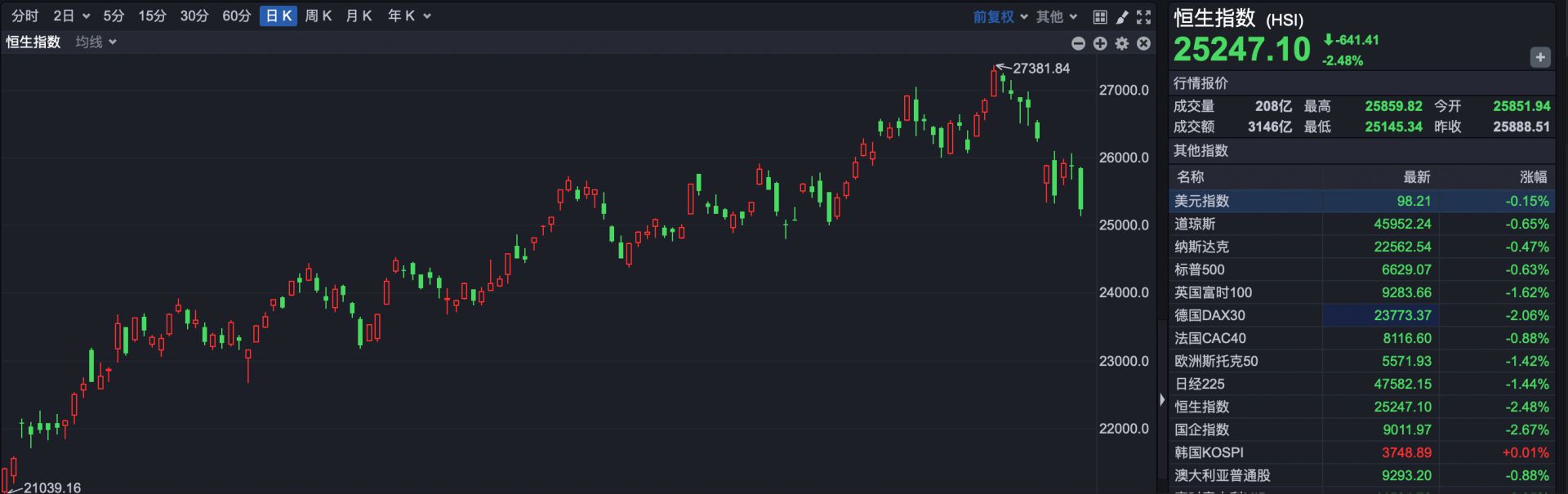 每经记者|曾子建 每经编辑|袁东 今日(10月17日),港股市场显著下挫。 截至收盘,恒指报收于25247.10点,下跌641.41点,跌幅2.46%,创下9月5日以来的收盘新低。