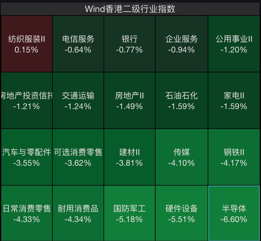 板块方面,wind香港二级行业指数全线回落,半导体、硬件设备、国防军工跌幅居前。