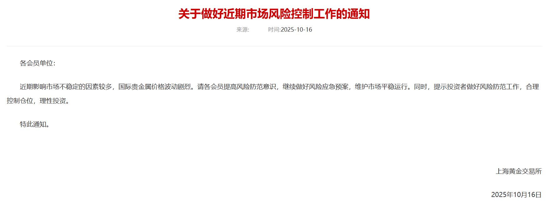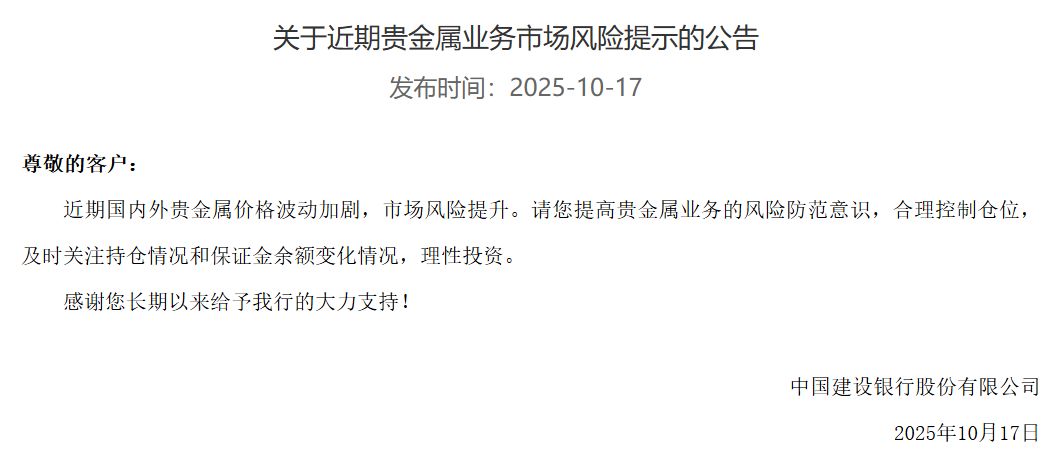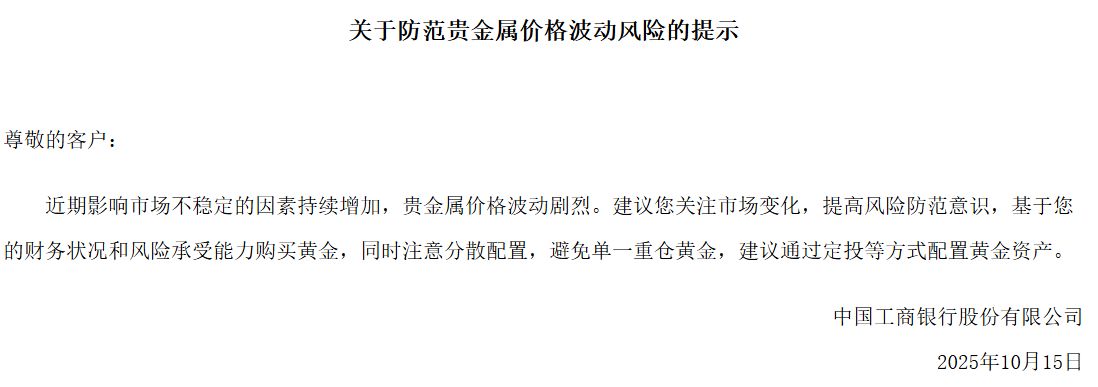 此外,近日工商银行、建设银行等多家银行也发布提示称,近期国内外贵金属价格波动加剧,市场风险提升,建议投资者基于财务状况及风险承受能力理性投资,合理安排贵金属资产规模。