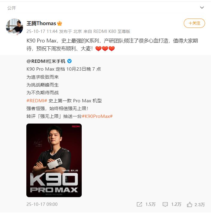 值得注意的是,10月17日前小米高管 王腾Thomas转发红米手机官方推文并表示:K90 Pro Max,史上最强的K系列,产研团队倾注了很多心血打造,值得大家期待,预祝下周发布顺利、大麦!